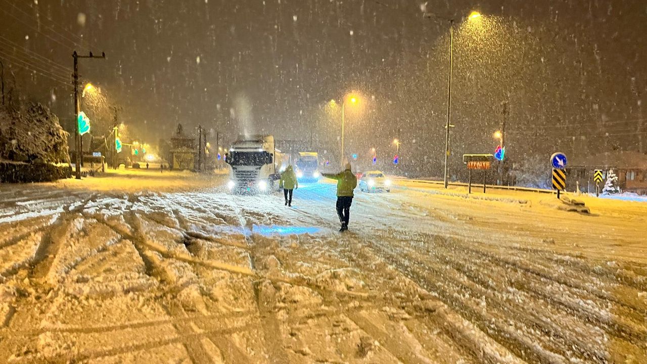 Trafik ekipleri, Bolu Dağı'nın Kaynaşlı mevkisinde kar yağışı ve buzlanma nedeniyle yolun ulaşıma kapanmaması için kontrol noktası oluşturdu.