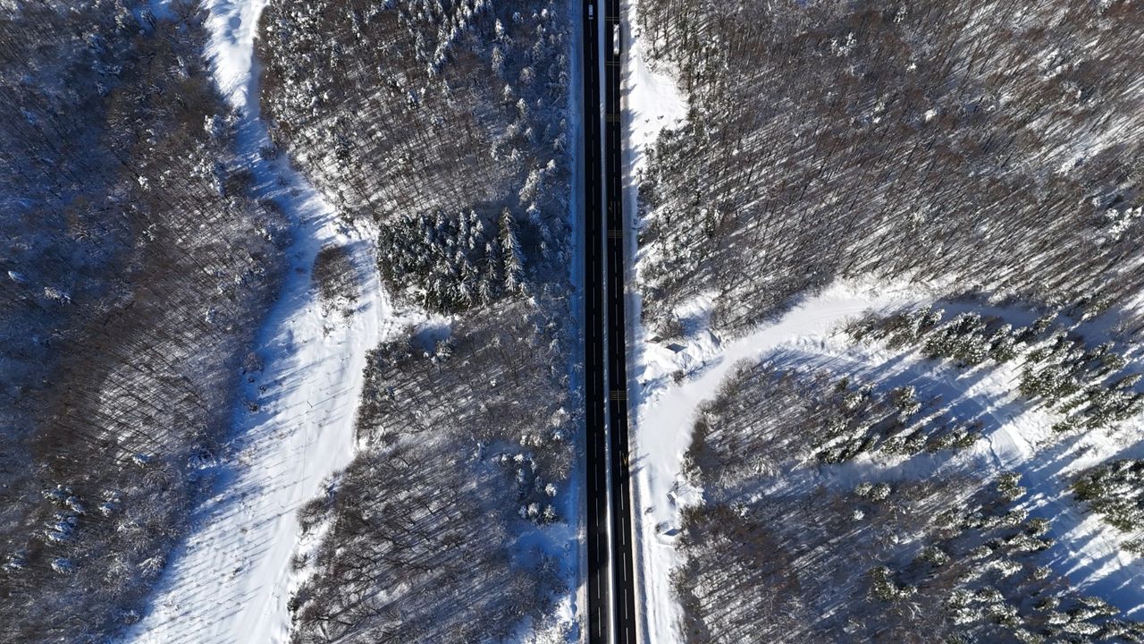 Bolu Dağı'nın D-100 kara yolu ve Anadolu Otoyolu geçişinde kar yağışının durmasının ardından ulaşım normale döndü. Bolu Dağı'nda karla kaplı ormanlarından arasından geçen D-100 kara yolu güzergahı, dron ile görüntülendi. (DHA)
