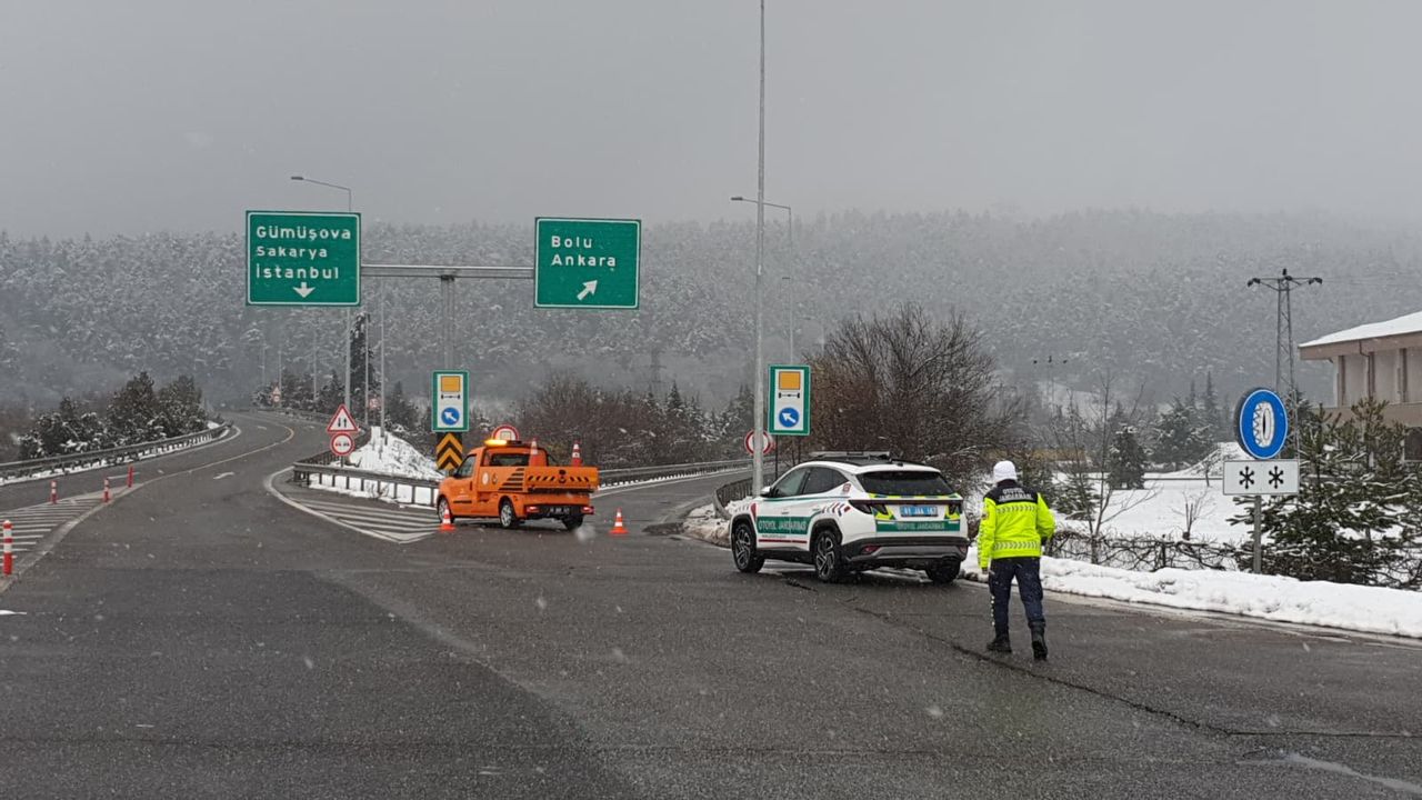 Bolu Dağı'nda yoğun kar yağışı nedeniyle D-100 kara yolu, ağır tonajlı araçların geçişine kapatıldı. Polis ekipleri, İstanbul yönüne giden ağır tonajlı araçları Bolu Elmalık Kavşağı'ndan, Ankara yönüne gidenleri de Kaynaşlı Kavşağı'ndan geri döndürüyor. Ayrıca Anadolu Otoyolu'nun Ankara istikametinde bir TIR'ın makaslayarak yolu kapatması nedeniyle sürücülerin, Düzce'nin Kaynaşlı ilçesinden Bolu Dağı istikametine geçişlerine izin verilmiyor. (DHA)