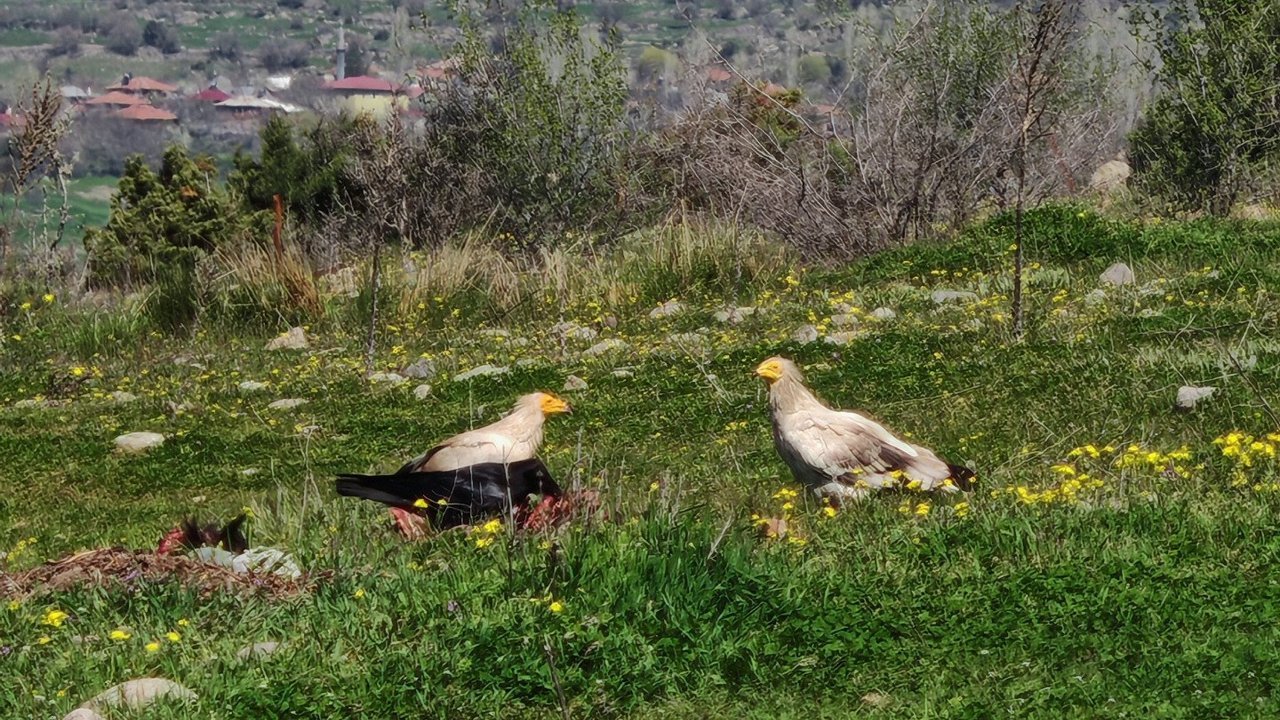 Bolu'nun Kıbrıscık ilçesinde doğa yürüyüşü yapan Patika14 Doğa Yürüyüşü Grubu lideri Muhammet Tarhan, arazide kuş hareketliliğini fark etti. Bölgeye yaklaşan Tarhan, açık alanda leşle beslenen nesli tükenme tehlikesi altındaki Türkiye'de en küçük akbabalar arasında yer alan Mısır akbabası ile karşılaştı. Tarhan, doğada nadir olarak görülen akbabaları cep telefonu ile görüntüledi. (DHA)