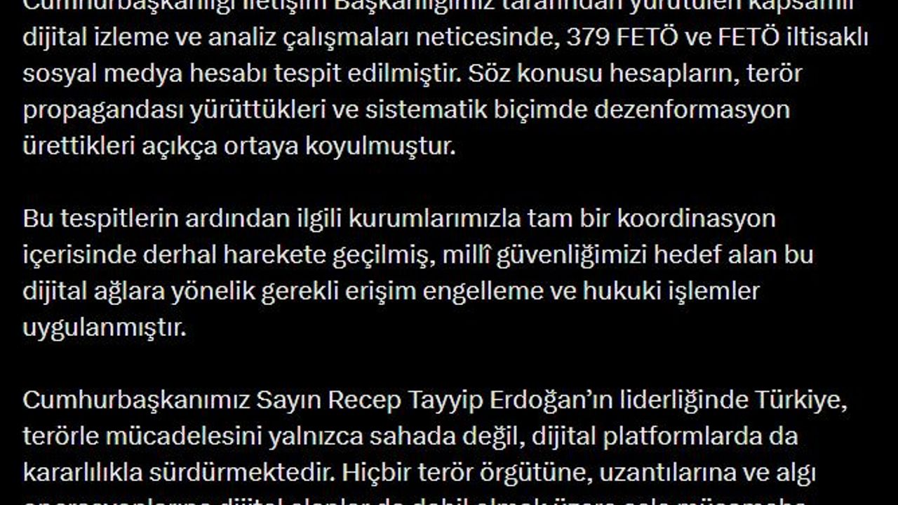 İletişim Başkanı Burhanettin Duran, sanal medya hesabından yaptığı paylaşımda, 'Cumhurbaşkanlığı İletişim Başkanlığımız tarafından yürütülen kapsamlı dijital izleme ve analiz çalışmaları neticesinde, 379 FETÖ ve FETÖ iltisaklı sosyal medya hesabı tespit edilmiştir. Söz konusu hesapların, terör propagandası yürüttükleri ve sistematik biçimde dezenformasyon ürettikleri açıkça ortaya koyulmuştur. Bu tespitlerin ardından ilgili kurumlarımızla tam bir koordinasyon içerisinde derhal harekete geçilmiş, milli güvenliğimizi hedef alan bu dijital ağlara yönelik gerekli erişim engelleme ve hukuki işlemler uygulanmıştır. Cumhurbaşkanımız Sayın Recep Tayyip Erdoğan'ın liderliğinde Türkiye, terörle mücadelesini yalnızca sahada değil, dijital platformlarda da kararlılıkla sürdürmektedir. Hiçbir terör örgütüne, uzantılarına ve algı operasyonlarına dijital alanlar da dahil olmak üzere asla müsamaha gösterilmeyecektir' ifadelerini kullandı. (DHA)