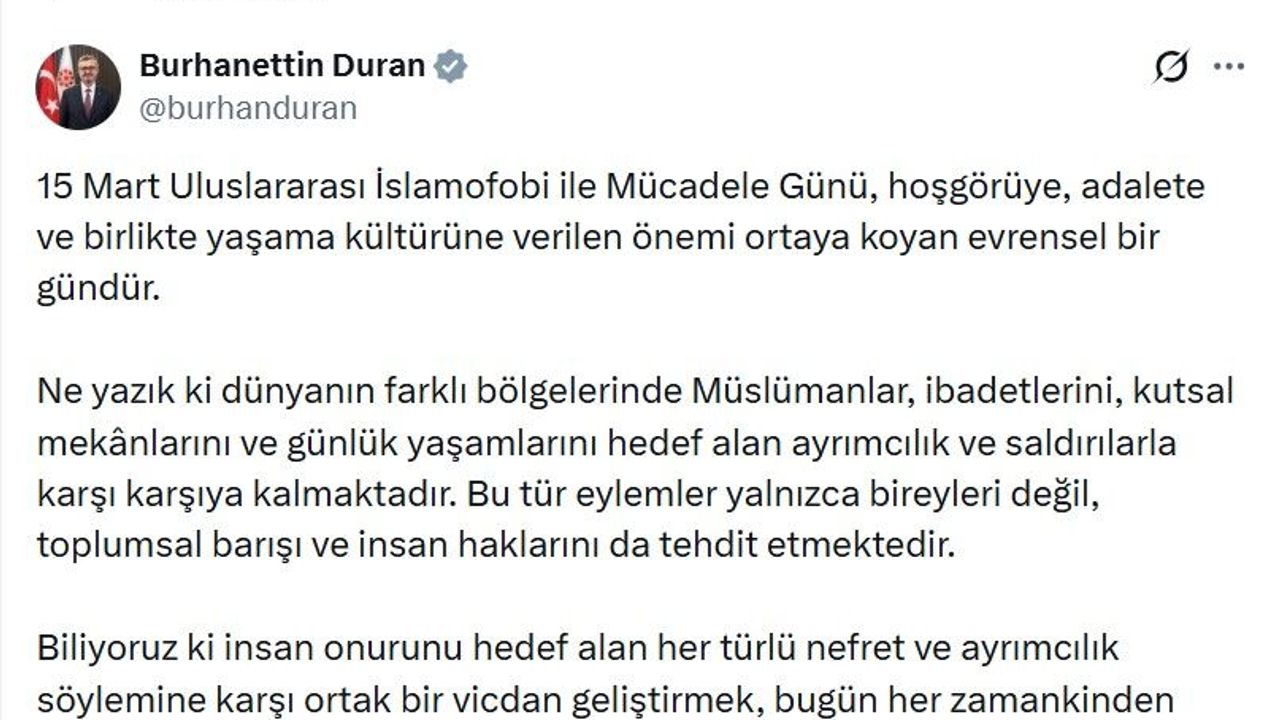 İletişim Başkanı Duran, sanal medya hesabından '15 Mart Uluslararası İslamofobi ile Mücadele Günü'ne ilişkin açıklama yaptı. Duran, '15 Mart Uluslararası İslamofobi ile Mücadele Günü, hoşgörüye, adalete ve birlikte yaşama kültürüne verilen önemi ortaya koyan evrensel bir gündür. Ne yazık ki dünyanın farklı bölgelerinde Müslümanlar, ibadetlerini, kutsal mekanlarını ve günlük yaşamlarını hedef alan ayrımcılık ve saldırılarla karşı karşıya kalmaktadır. Bu tür eylemler yalnızca bireyleri değil, toplumsal barışı ve insan haklarını da tehdit etmektedir. Biliyoruz ki insan onurunu hedef alan her türlü nefret ve ayrımcılık söylemine karşı ortak bir vicdan geliştirmek, bugün her zamankinden daha büyük bir sorumluluktur' ifadelerini kullandı. (DHA)