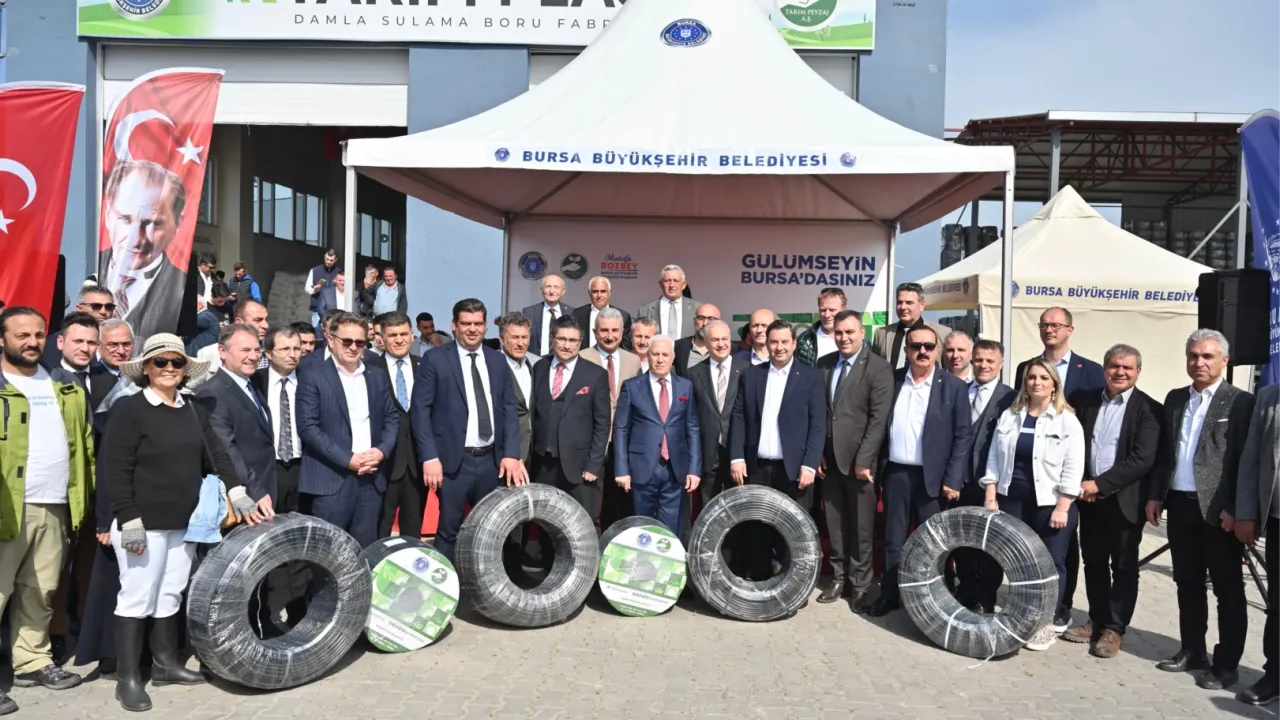 Bursa Büyükşehir Belediyesi’nin Tarım Peyzaj AŞ yatırımıyla kente kazandırdığı Damla Sulama Boru Üretim Tesisi’nde (Tarım Plast Fabrikası) yüzde 100 geri dönüşüm hammaddesiyle üretilen yaklaşık 10 bin sulama borusu, düzenlenen törenle çiftçilere teslim edildi.BURSA (İGFA) - Bursa’da her alanda çiftçiyi destekleyen Büyükşehir Belediyesi, kentin tarımsal geleceğini şekillendirmeye, suyun verimli kullanımını sağlayarak bereketli topraklara hayat katmaya devam ediyor.