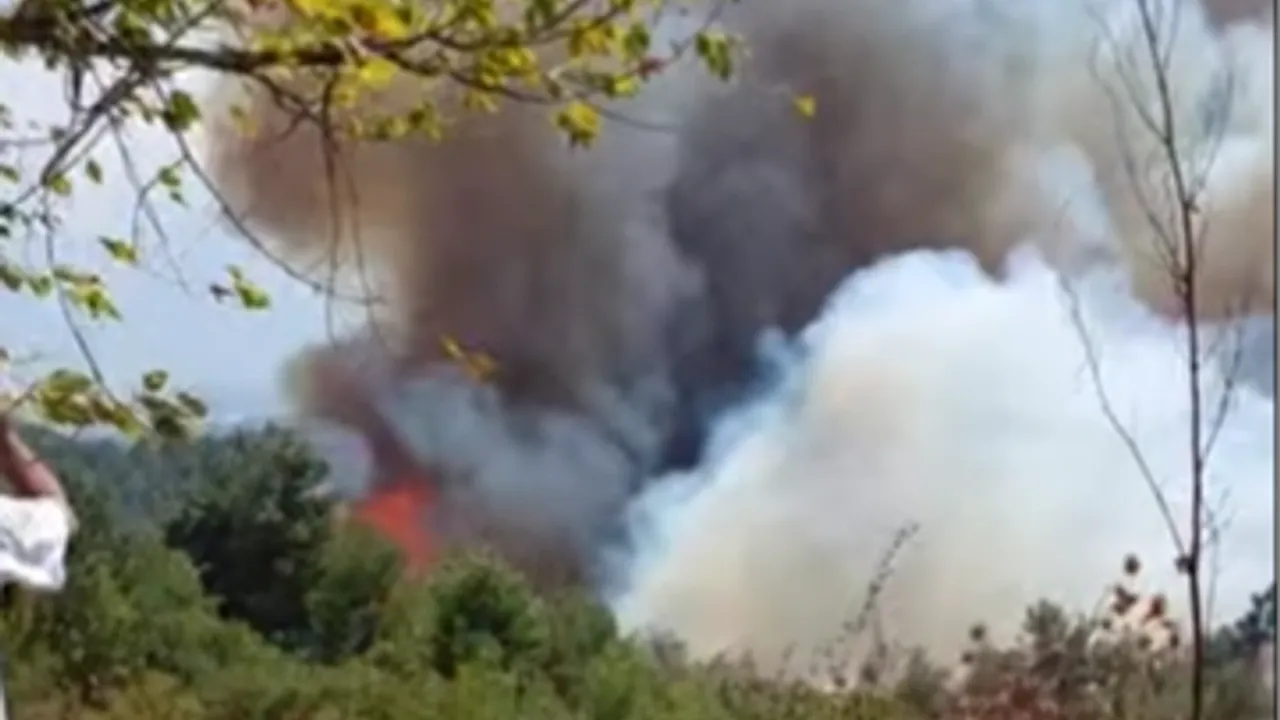 Orman Bölge Müdürlüğü ve itfaiye ekipleri, arazöz ve itfaiye araçlarıyla karadan müdahale ederken, iki helikopterle havadan destek sağlanıyor.