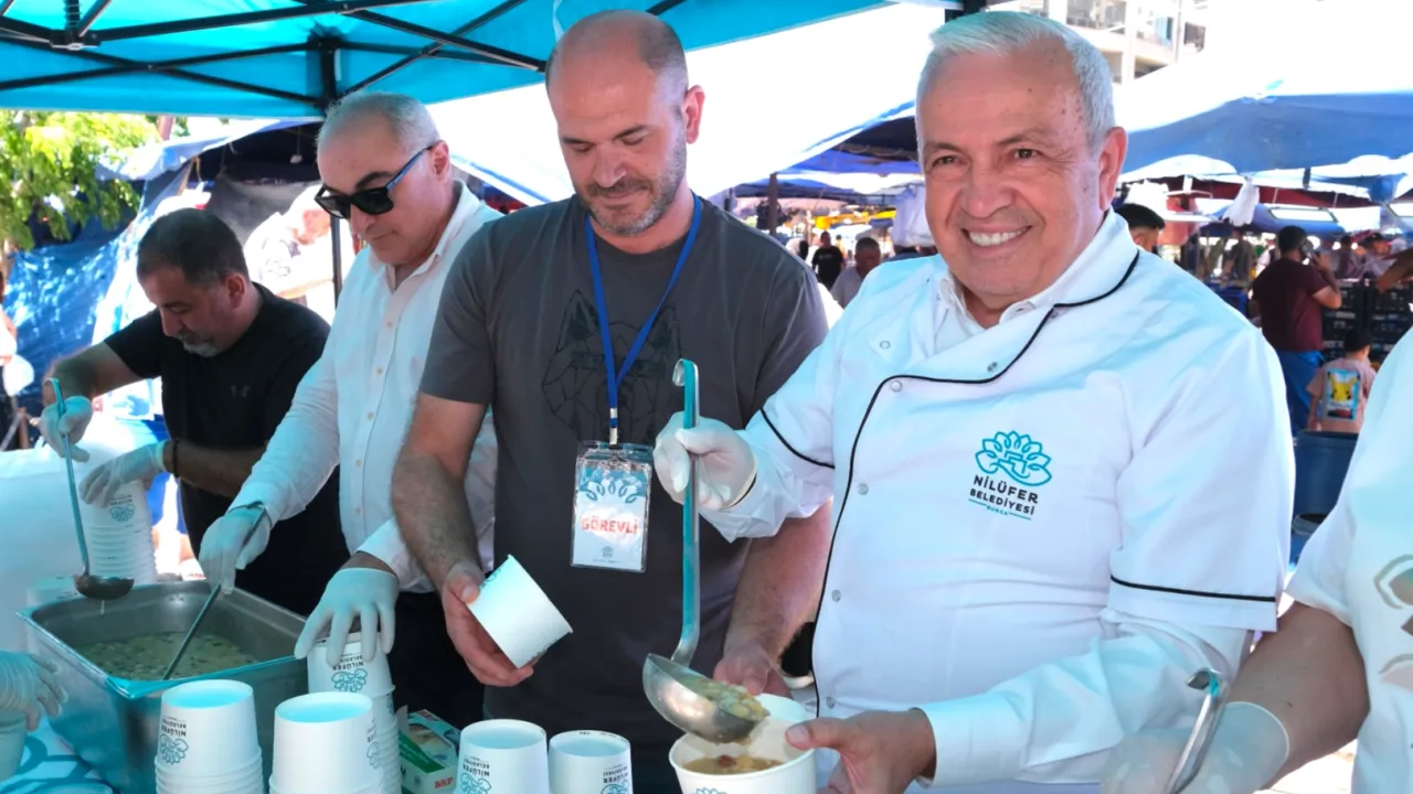 Bursa'da Nilüfer Belediye Başkanı Şadi Özdemir, Ataevler Mahallesi’ndeki aşure dağıtımına katıldı. Vatandaşlara aşure ikram eden Başkan Şadi Özdemir, bolluk ve bereket diledi.BURSA (İGFA) - Bursa Nilüfer Belediyesi, her yıl Muharrem ayında yapılan ve geleneksel hale gelen aşure ikramlarını bu yıl da her gün iki mahallede sürdürüyor.