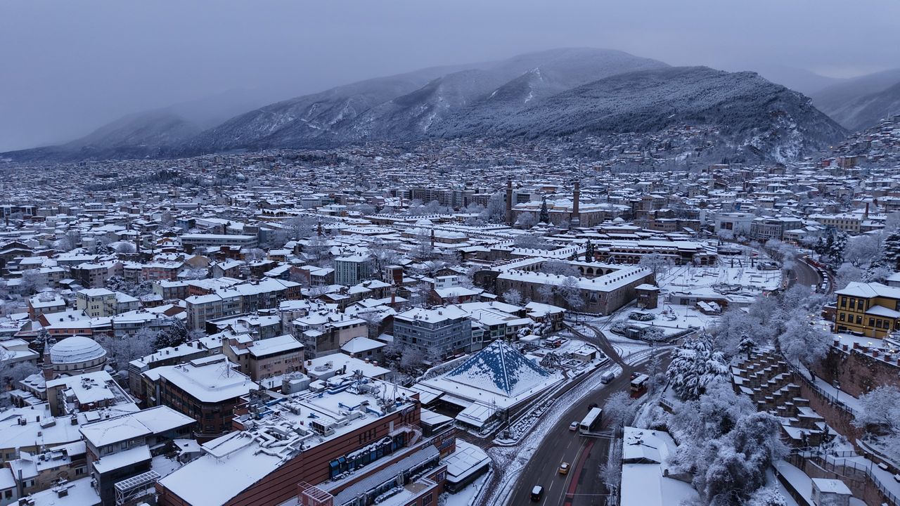 BEYAZA BÜRÜNEN 'YEŞİL BURSA' DRONLA GÖRÜNTÜLENDİ
