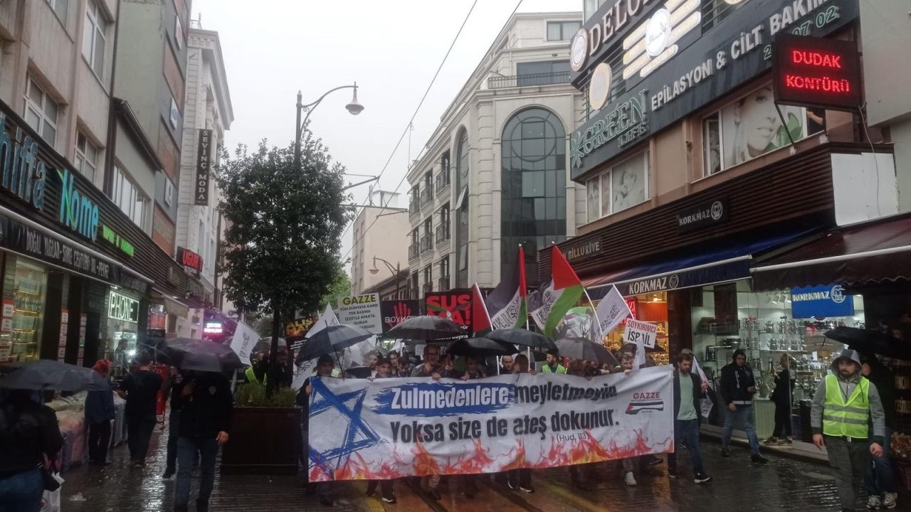 Türk ve Filistin bayrakları taşıyan katılımcılar, pankart ve sloganlarla İsrail'i protesto etti.