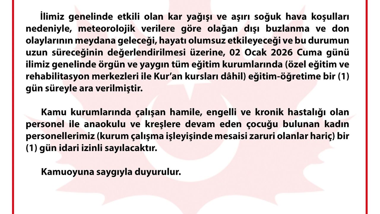 'İlimiz genelinde etkili olan kar yağışı ve aşırı soğuk hava koşulları nedeniyle, meteorolojik verilere göre olağan dışı buzlanma ve don olaylarının meydana geleceği, hayatı olumsuz etkileyeceği ve bu durumun uzun süreceğinin değerlendirilmesi üzerine, 02 Ocak 2026 Cuma günü ilimiz genelinde örgün ve yaygın tüm eğitim kurumlarında (özel eğitim ve rehabilitasyon merkezleri ile Kur'an kursları dahil) eğitim-öğretime bir (1) gün süreyle ara verilmiştir.