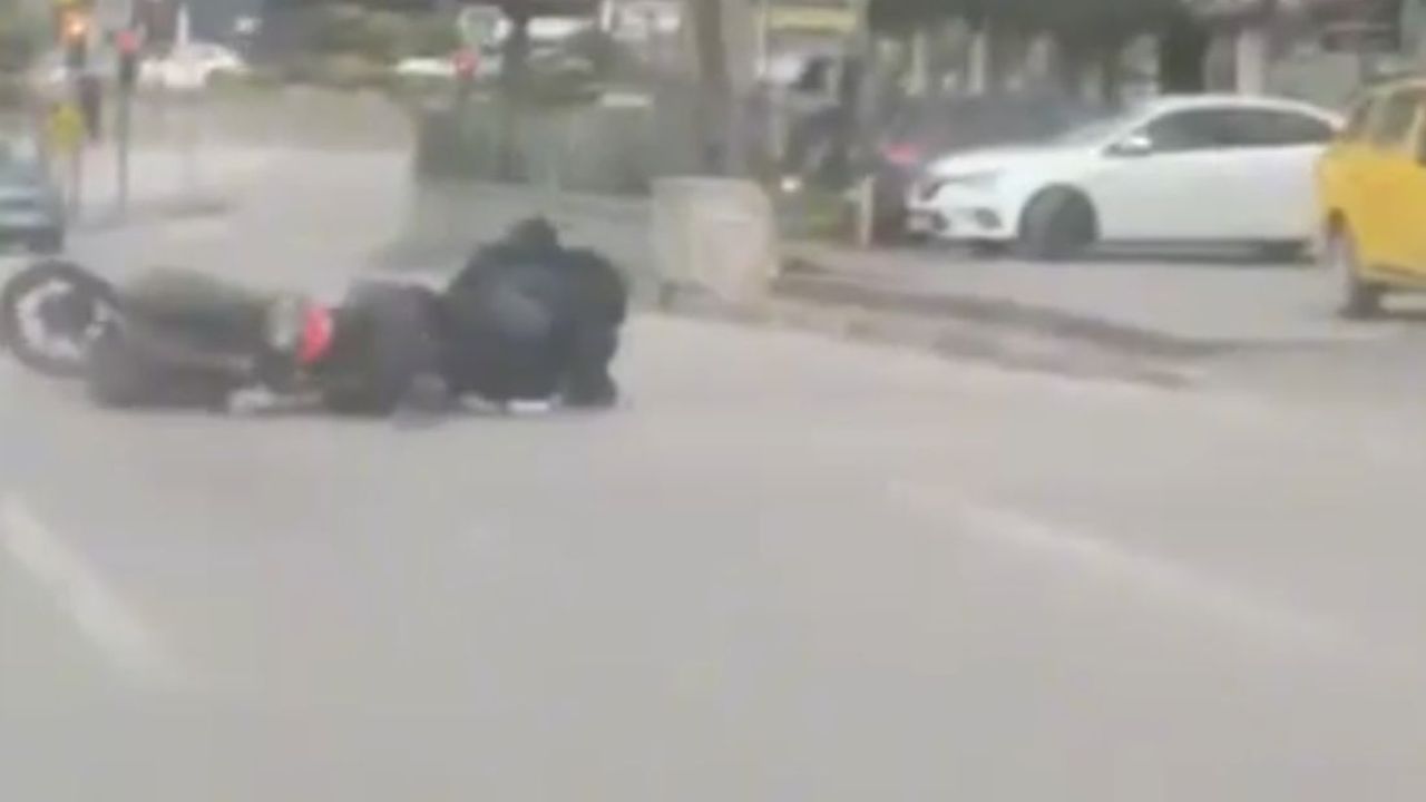 Bursa'da hızı zaman zaman saatte 75 kilometreye ulaşan lodos nedeniyle Yıldırım ilçesindeki lastikçi dükkanında bir oto lastiği hareket edip caddeye çıktı. Bu sırada caddede seyir halindeki bir motosiklet sürücü, yoldaki lastiği durdurmak isterken dengesini kaybedip, aracıyla devrildi. O anlar başka bir otomobil sürücüsü tarafından cep telefonu kamerasıyla görüntülendi. (DHA)