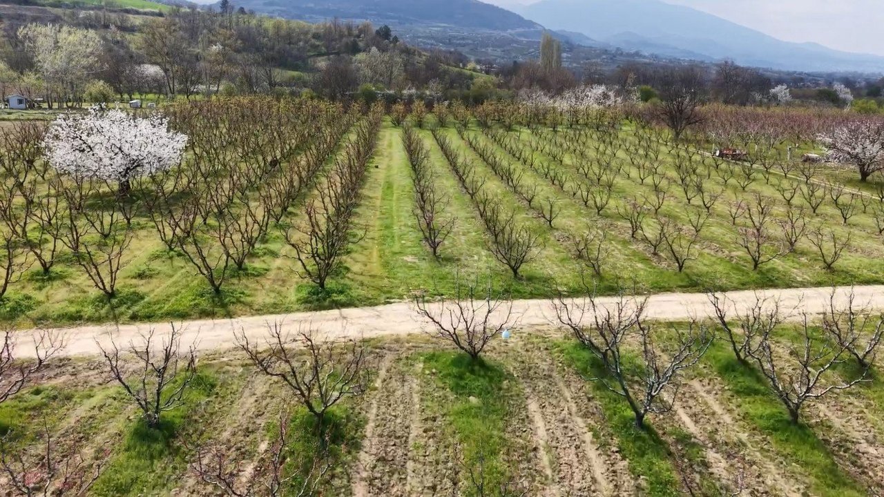 Bursa'da meyve ağaçlarının çiçek açtığı bahçeler dronla görüntülendi