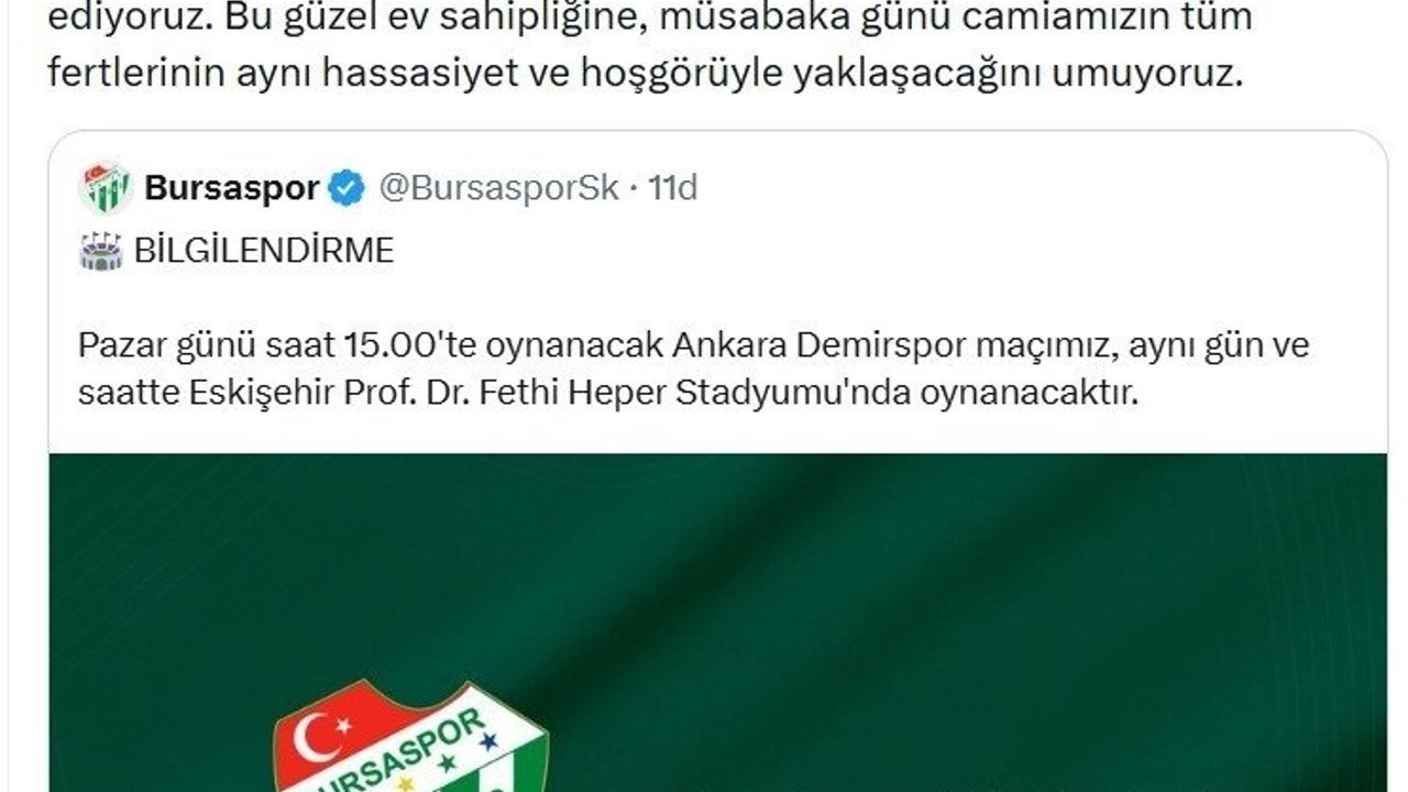 Konuya ilişkin Bursaspor Başkanı Enes Çelik'in sanal medya hesabından yaptığı paylaşımda, '12 Nisan Pazar günü oynayacağımız Ankara Demirspor müsabakası, yapılan başvurular neticesinde Eskişehir Prof. Dr. Fethi Heper Stadyumu'nda oynanacaktır. Ev sahipliğini kabul eden dost Eskişehirspor camiasına çok teşekkür ediyoruz. Bu güzel ev sahipliğine, müsabaka günü camiamızın tüm fertlerinin aynı hassasiyet ve hoşgörüyle yaklaşacağını umuyoruz' ifadeleri yer aldı. (DHA)