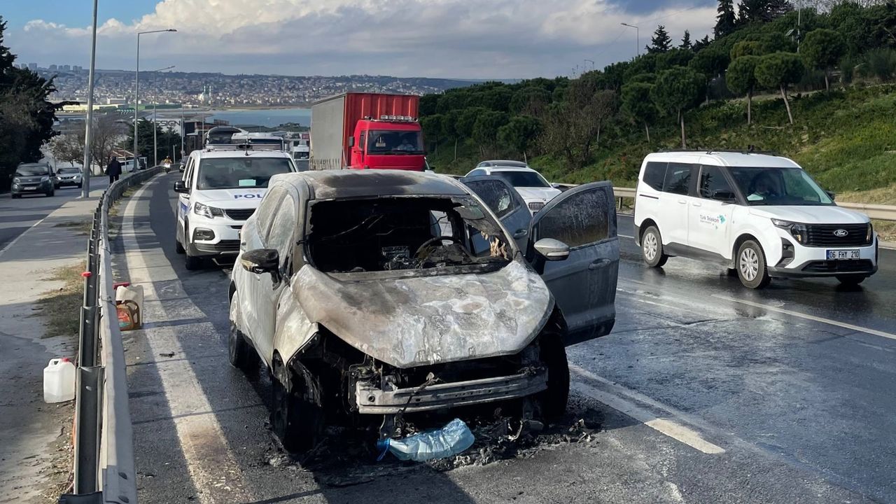Sürücü, otomobili yolun kenarında durdururken, alevler aracı sardı.