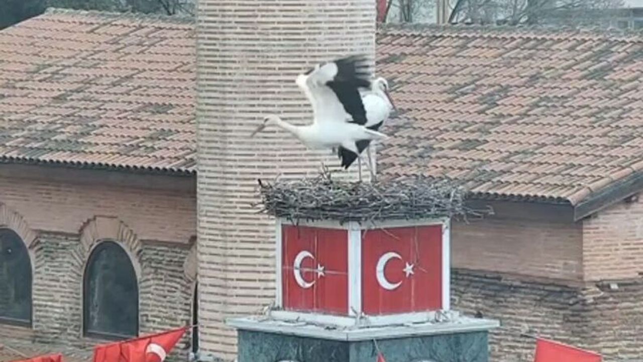 Semih TÜRKER/İZNİK (Bursa), (DHA)-BURSA'nın İznik ilçesinde 'Can' ve 'Canan' adı verilen leylekler, geçen yıl saat kulesinin üstüne özel olarak yapılan yuvalarına 2'nci kez geldi. 4 gün arayla göçten dönen leylek çiftinin buluşma anı, güvenlik kamerasına yansıdı.