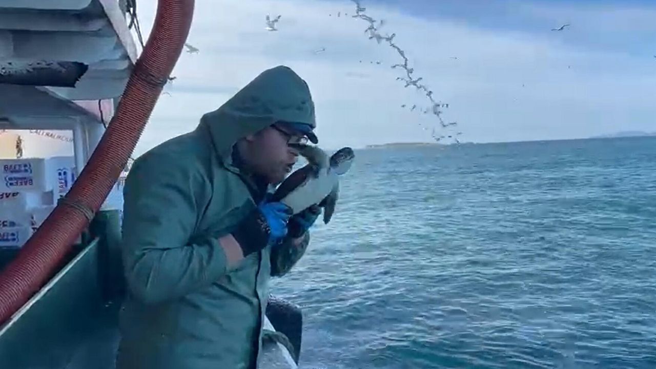 Bozcaada açıklarında dün 'Çalı Balıkçılık' isimli gırgır teknesiyle denize açılan Naci Karabiber ile tayfası, ağlarını denize bıraktı. Bir süre sonra ağları toplayan balıkçılar, ağların içerisinde bir deniz kaplumbağası türü carretta caretta olduğunu fark etti. Caretta carettayı ağdan kurtarıp tekneye alan balıkçılar, caretta carettayı öperek denize bıraktı. O anlar, cep telefonu ile kaydedildi.(DHA)