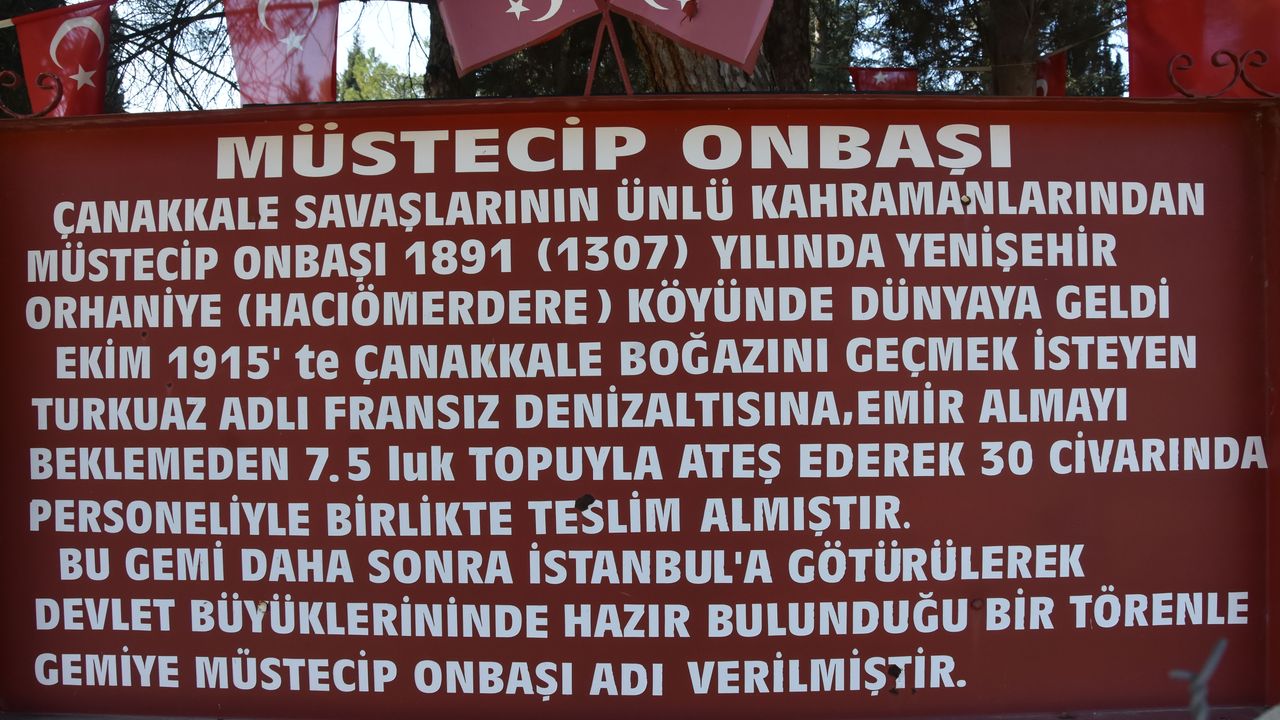 Mehmet İNAN/YENİŞEHİR (Bursa), (DHA)- ÇANAKKALE Savaşı'nda, boğazdan geçen Fransız denizaltısı 'Turquoise'yi fark ederek komutanından izinsiz olarak ateşlediği topla periskopundan vuran ve bu denizaltının ele geçirilmesini sağlayan Müstecip Onbaşı, savaşın unutulan kahramanlarından oldu. 1959'da hayatını kaybeden ve kabri Bursa'nın Yenişehir ilçesinde bulunan Müstecip Onbaşı'yı anlatan tarihçi doktor Salih Erol, 'Müstecip Onbaşı'nın tıpkı büyük kahramanlarımız Seyit Onbaşı gibi, Ezineli Yahya Çavuş gibi, onların hak ettiği değeri görmesini istiyoruz' dedi.