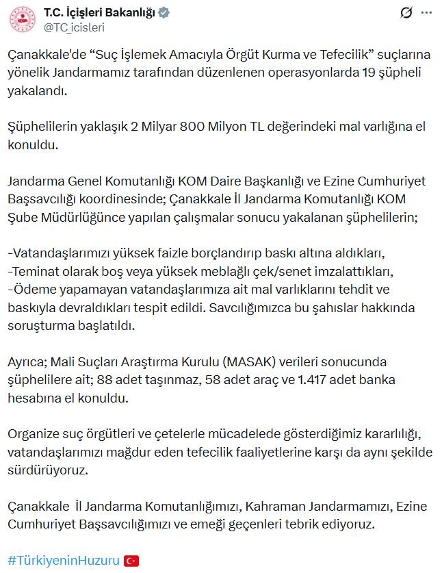Bakanlığın sanal medya hesabından yapılan açıklamaya göre; Çanakkale İl Jandarma Komutanlığı KOM Şube Müdürlüğü tarafından yapılan çalışmalar sonucu 19 şüpheli yakalandı. Şüphelilerin; vatandaşları yüksek faizle borçlandırıp baskı altına aldıkları, teminat olarak boş veya yüksek meblağlı çek/senet imzalattıkları, ödeme yapamayan vatandaşlara ait mal varlıklarını tehdit ve baskıyla devraldıkları tespit edildi. Mali Suçları Araştırma Kurulu (MASAK) verileri sonucunda şüphelilere ait; yaklaşık 2 milyar 800 milyon TL değerindeki 88 taşınmaz, 58 araç ve 1417 banka hesabına el konuldu. (DHA)