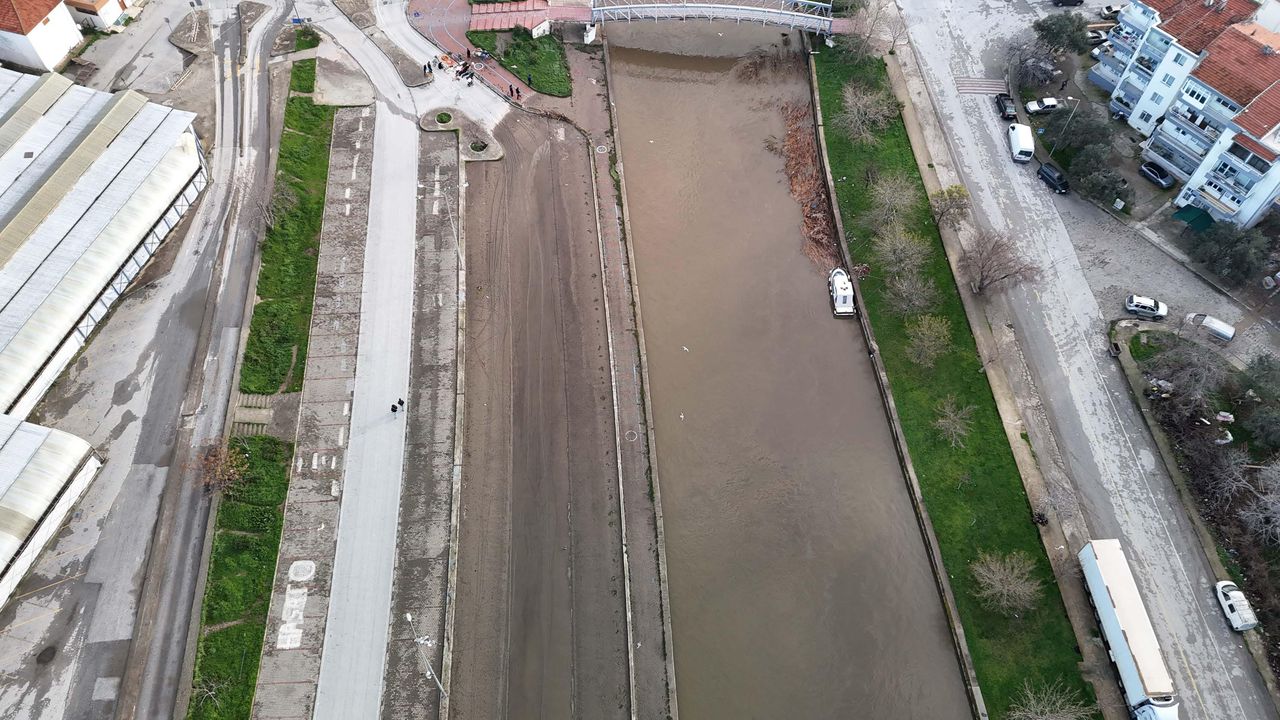 Çanakkale'de etkili olan sağanağın ardından Atikhisar Barajı'ndaki su seviyesi yüzde 100'e ulaştı. Daha sonra barajın dolusavağı açıldı. Dün hem sağanak hem de açılan dolusavağın ardından kenti ikiye bölen Sarıçay taştı. Taşkın nedeniyle bölgede bulunan bazı işletmeler ile köy minibüslerinin durak olarak kullandığı alan su altında kaldı. Duraktaki araçlar şoförler tarafından son anda kurtarılırken, Sarıçay yatağındaki bazı tekneler suya gömüldü. Sarıçay'ın debisinin düşmesinin ardından su geri çekildi. Suyun çekilmesi ile ortaya çıkan alan dron ile havadan görüntülendi. (DHA)