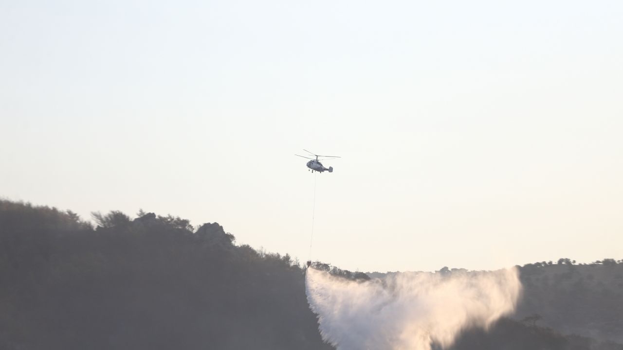 Günün ilk ışıklarıyla birlikte 2 helikopter yangını söndürme çalışmalarına havadan destek vermeye başladı.