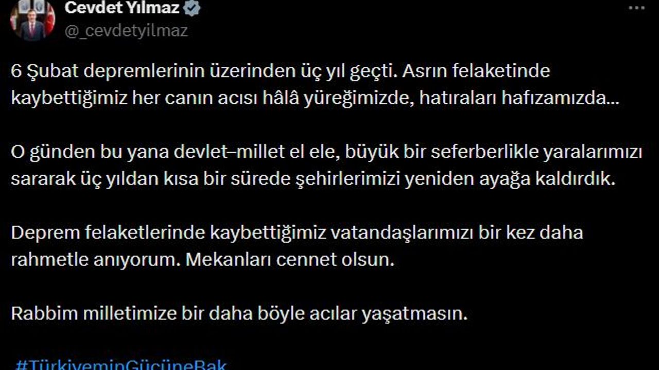 Cumhurbaşkanı Yardımcısı Cevdet Yılmaz, Kahramanmaraş merkezli depremlerin 3'üncü yıl dönümü dolayısıyla sanal medya hesabından yaptığı paylaşımda, '6 Şubat depremlerinin üzerinden 3 yıl geçti. 'Asrın Felaketi'nde kaybettiğimiz her canın acısı hala yüreğimizde, hatıraları hafızamızda. O günden bu yana devlet-millet el ele, büyük bir seferberlikle yaralarımızı sararak 3 yıldan kısa bir sürede şehirlerimizi yeniden ayağa kaldırdık. Deprem felaketlerinde kaybettiğimiz vatandaşlarımızı bir kez daha rahmetle anıyorum. Mekanları cennet olsun. Rabbim milletimize bir daha böyle acılar yaşatmasın' ifadelerini kullandı. (DHA)