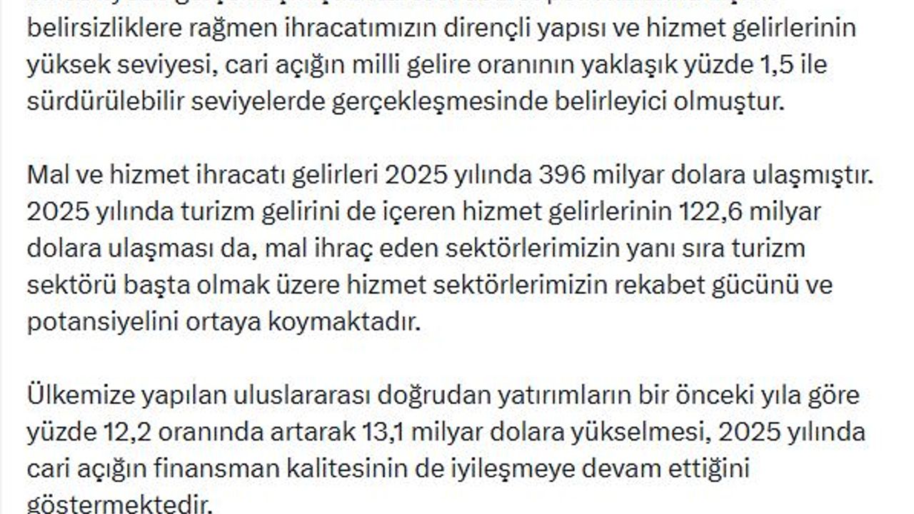 Cumhurbaşkanı Yardımcısı Cevdet Yılmaz, ödemeler dengesi istatistiklerine ilişkin sanal medya hesabından açıklama yaptı. Yılmaz, 'Sürdürülebilir seviyelerde seyreden cari açık, azalan ülke risk primi ve artan ülke kredi not görünümü ile makro finansal istikrarımız güçlenmeye devam etmektedir. Cari açık 2025 yılında 25,2 milyar dolar ile OVP tahminlerimizle uyumlu bir seviyede gerçekleşmiştir. Küresel ticaret politikalarına ilişkin belirsizliklere rağmen ihracatımızın dirençli yapısı ve hizmet gelirlerinin yüksek seviyesi, cari açığın milli gelire oranının yaklaşık yüzde 1,5 ile sürdürülebilir seviyelerde gerçekleşmesinde belirleyici olmuştur. Mal ve hizmet ihracatı gelirleri 2025 yılında 396 milyar dolara ulaşmıştır. 2025 yılında turizm gelirini de içeren hizmet gelirlerinin 122,6 milyar dolara ulaşması da mal ihraç eden sektörlerimizin yanı sıra turizm sektörü başta olmak üzere hizmet sektörlerimizin rekabet gücünü ve potansiyelini ortaya koymaktadır. Ülkemize yapılan uluslararası doğrudan yatırımların bir önceki yıla göre yüzde 12,2 oranında artarak 13,1 milyar dolara yükselmesi, 2025 yılında cari açığın finansman kalitesinin de iyileşmeye devam ettiğini göstermektedir. 2026 yılında mal ihracatımızı 282 milyar dolar düzeyine yükseltmeyi, mal ve hizmet ihracatında ise 410 milyar doları aşmayı hedefliyoruz. Cari açığımızın yıl genelinde ılımlı seyrini sürdüreceğini ve yapısal reformlarla desteklediğimiz dezenflasyon sürecini desteklemeye devam edeceğini öngörüyoruz' dedi. (DHA)