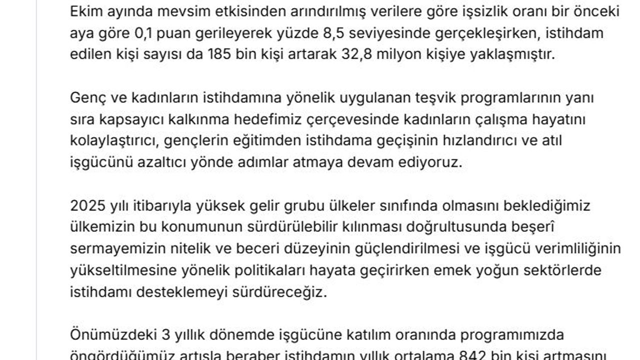 Cevdet Yılmaz, Türkiye İstatistik Kurumu'nun (TÜİK) açıkladığı Ekim 2025 dönemine ilişkin iş gücü istatistikleriyle ilgili değerlendirmede bulundu. Yılmaz, sosyal medya hesabından yaptığı açıklamada, 'İş gücü piyasamızdaki güçlü görünüm ekim ayında devam ederken, 30 aydır tek haneli seviyelerde seyreden işsizlik oranı, ekonomiye duyulan güveni pekiştirmiştir. Ekim ayında mevsim etkisinden arındırılmış verilere göre işsizlik oranı bir önceki aya göre 0,1 puan gerileyerek yüzde 8,5 seviyesinde gerçekleşirken, istihdam edilen kişi sayısı da 185 bin kişi artarak 32,8 milyon kişiye yaklaşmıştır. Genç ve kadınların istihdamına yönelik uygulanan teşvik programlarının yanı sıra kapsayıcı kalkınma hedefimiz çerçevesinde kadınların çalışma hayatını kolaylaştırıcı, gençlerin eğitimden istihdama geçişinin hızlandırıcı ve atıl iş gücünü azaltıcı yönde adımlar atmaya devam ediyoruz' dedi.