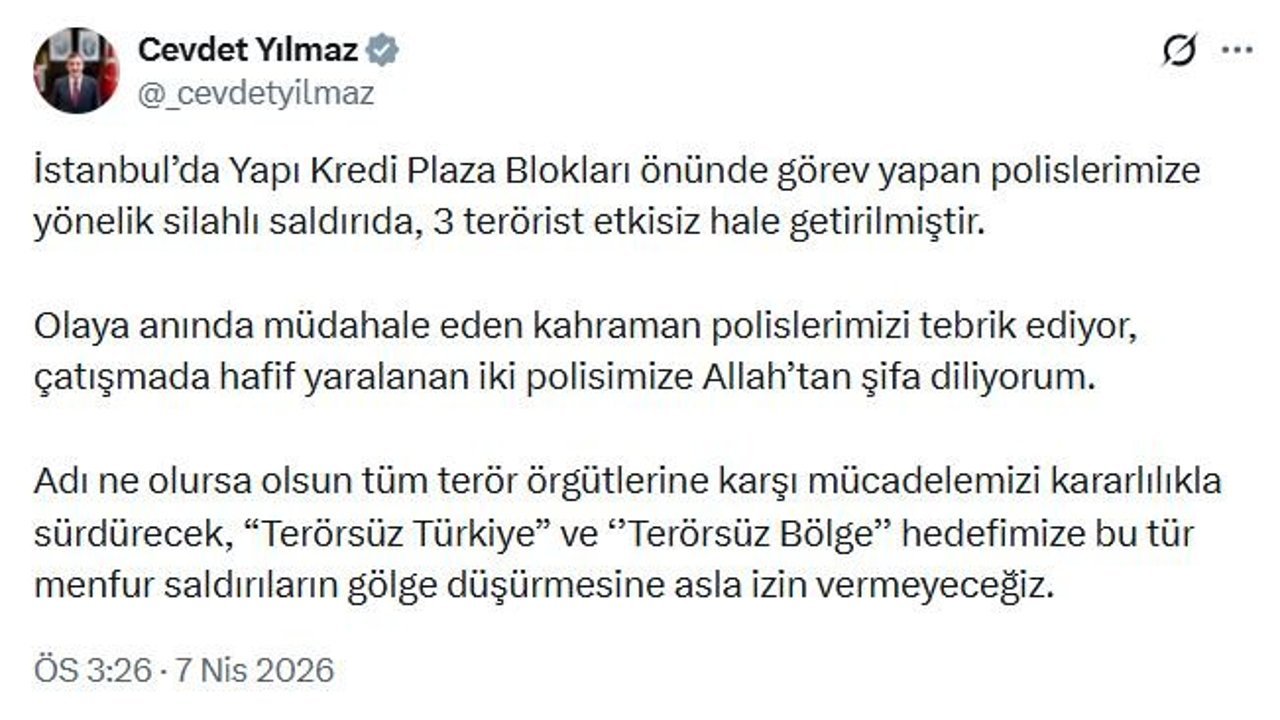 Cumhurbaşkanı Yardımcısı Cevdet Yılmaz, sanal medya hesabından yaptığı açıklamada, 'İstanbul'da Yapı Kredi Plaza Blokları önünde görev yapan polislerimize yönelik silahlı saldırıda, 3 terörist etkisiz hale getirilmiştir. Olaya anında müdahale eden kahraman polislerimizi tebrik ediyor, çatışmada hafif yaralanan iki polisimize Allah'tan şifa diliyorum. Adı ne olursa olsun tüm terör örgütlerine karşı mücadelemizi kararlılıkla sürdürecek, 'Terörsüz Türkiye' ve 'terörsüz bölge' hedefimize bu tür menfur saldırıların gölge düşürmesine asla izin vermeyeceğiz' dedi. (DHA)