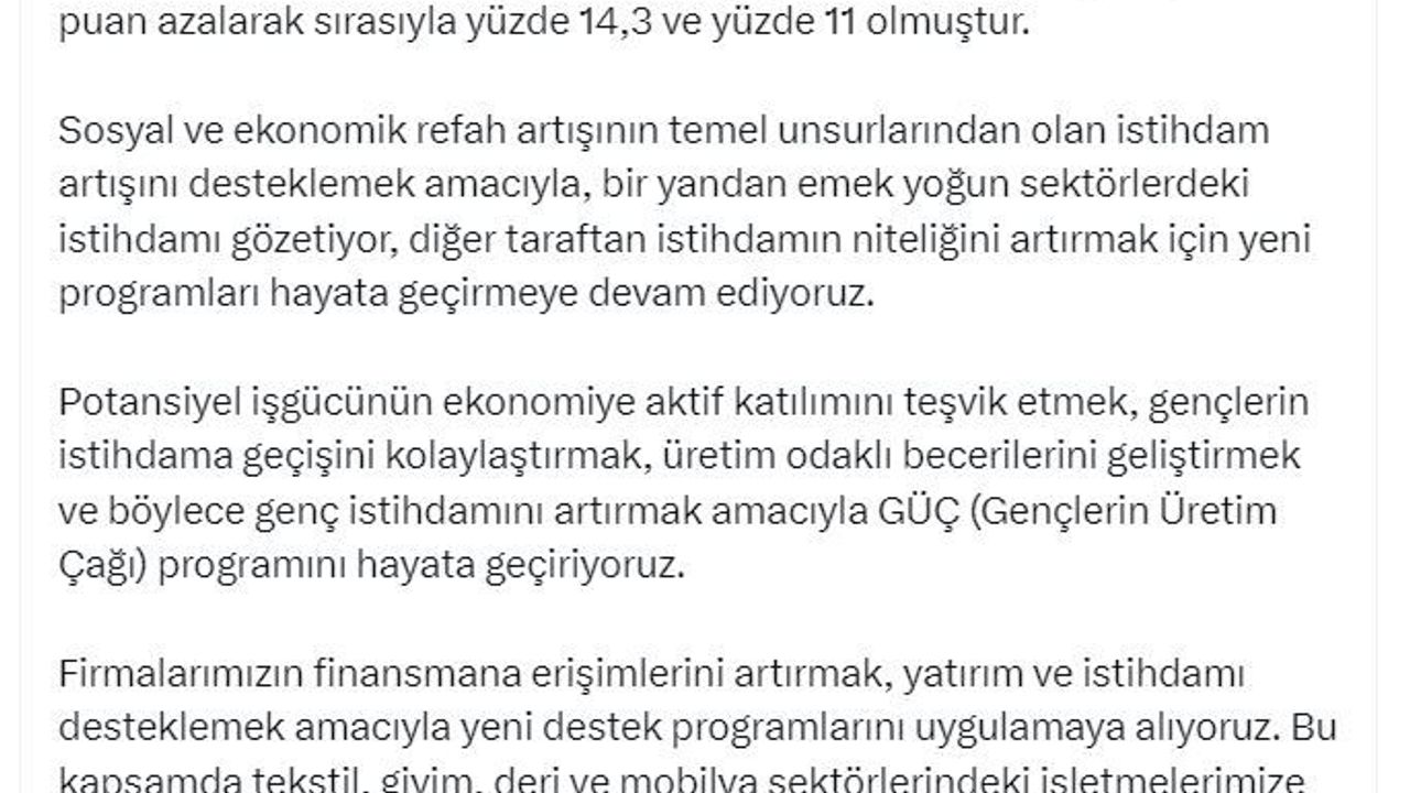 Yılmaz, potansiyel iş gücünün ekonomiye aktif katılımını teşvik etmek, gençlerin istihdama geçişini kolaylaştırmak, üretim odaklı becerilerini geliştirmek ve böylece genç istihdamını artırmak amacıyla GÜÇ (Gençlerin Üretim Çağı) programını hayata geçirdiklerini anımsatarak, 'Firmalarımızın finansmana erişimlerini artırmak, yatırım ve istihdamı desteklemek amacıyla yeni destek programlarını uygulamaya alıyoruz. Bu kapsamda tekstil, giyim, deri ve mobilya sektörlerindeki işletmelerimize sunduğumuz çalışan başına destek tutarını 3 bin 500 TL'ye yükselttik, destek kapsamına büyük ölçekli firmaları da dahil ettik. Ayrıca imalat sanayimizde özellikle KOBİ'lerimize yönelik 100 milyar TL büyüklükte yeni bir finansman programı başlattık. Yatırım, istihdam, üretim ve ihracat odaklı politikalarımız ile dengeli büyüme ve istikrarı güçlendirme perspektifi içinde sosyal refahı kalıcı bir şekilde artırmayı amaçlıyoruz' ifadelerine yer verdi. (DHA)