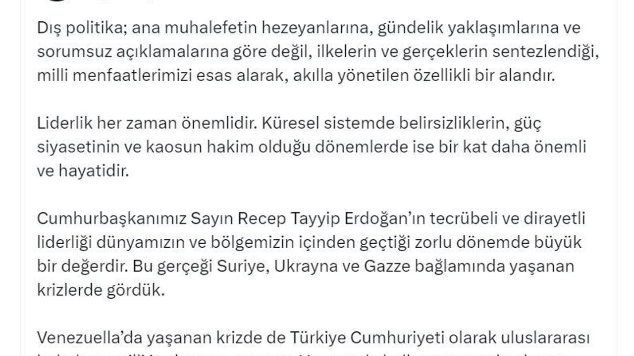 Cevdet Yılmaz, sanal medya hesabından yaptığı açıklamada, 'Dış politika; ana muhalefetin hezeyanlarına, gündelik yaklaşımlarına ve sorumsuz açıklamalarına göre değil, ilkelerin ve gerçeklerin sentezlendiği, milli menfaatlerimizi esas alarak, akılla yönetilen özellikli bir alandır. Liderlik her zaman önemlidir. Küresel sistemde belirsizliklerin, güç siyasetinin ve kaosun hakim olduğu dönemlerde ise bir kat daha önemli ve hayatidir. Cumhurbaşkanımız Sayın Recep Tayyip Erdoğan'ın tecrübeli ve dirayetli liderliği dünyamızın ve bölgemizin içinden geçtiği zorlu dönemde büyük bir değerdir. Bu gerçeği Suriye, Ukrayna ve Gazze bağlamında yaşanan krizlerde gördük. Venezuella'da yaşanan krizde de Türkiye Cumhuriyeti olarak uluslararası hukukun, milli iradeye saygının ve Venezuela halkının yanında olmaya; tüm taraflarla diyalog içinde istikrarı savunmaya devam edeceğiz' ifadelerini kullandı. (DHA)
