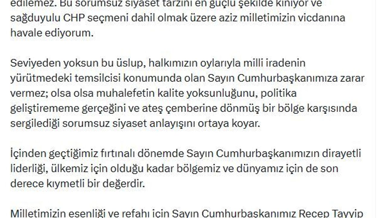 Cumhurbaşkanı Yardımcısı Yılmaz, sanal medya üzerinden yaptığı paylaşımda, 'CHP Genel Başkanı tarafından Sayın Cumhurbaşkanımıza yönelik olarak demokratik rekabet ölçülerini açıkça ihlal eden hakaretler kabul edilemez. Bu sorumsuz siyaset tarzını en güçlü şekilde kınıyor ve sağduyulu CHP seçmeni dahil olmak üzere aziz milletimizin vicdanına havale ediyorum. Seviyeden yoksun bu üslup, halkımızın oylarıyla milli iradenin yürütmedeki temsilcisi konumunda olan Sayın Cumhurbaşkanımıza zarar vermez; olsa olsa muhalefetin kalite yoksunluğunu, politika geliştirememe gerçeğini ve ateş çemberine dönmüş bir bölge karşısında sergilediği sorumsuz siyaset anlayışını ortaya koyar. İçinden geçtiğimiz fırtınalı dönemde Sayın Cumhurbaşkanımızın dirayetli liderliği, ülkemiz için olduğu kadar bölgemiz ve dünyamız için de son derece kıymetli bir değerdir. Milletimizin esenliği ve refahı için Sayın Cumhurbaşkanımız Recep Tayyip Erdoğan liderliğinde gece gündüz çalışmaya; polemik ve kutuplaştırma siyaseti yerine, milli birliğimizi güçlendirmeye ve halkımıza hizmet etmeye devam edeceğiz' ifadelerine yer verdi. (DHA)