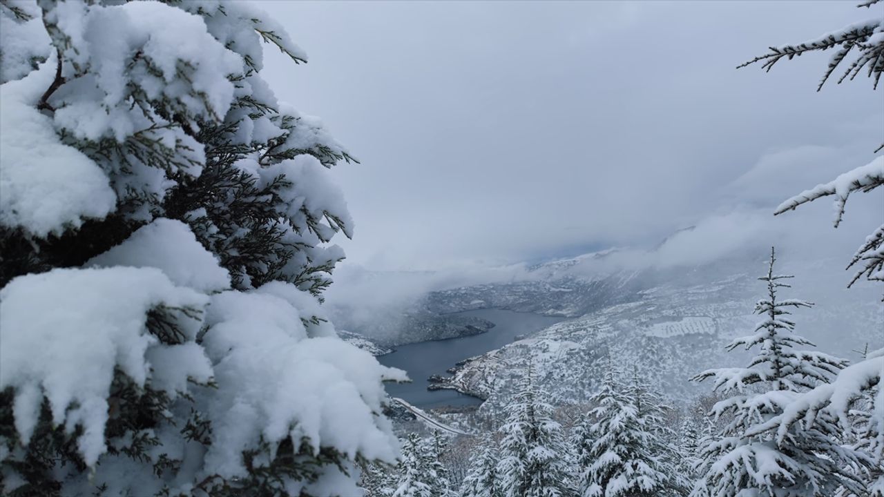 Kızılırmak Nehri üzerine kurulu Obruk Barajı'nın çevresindeki orman da beyaz örtüyle kaplandı.
