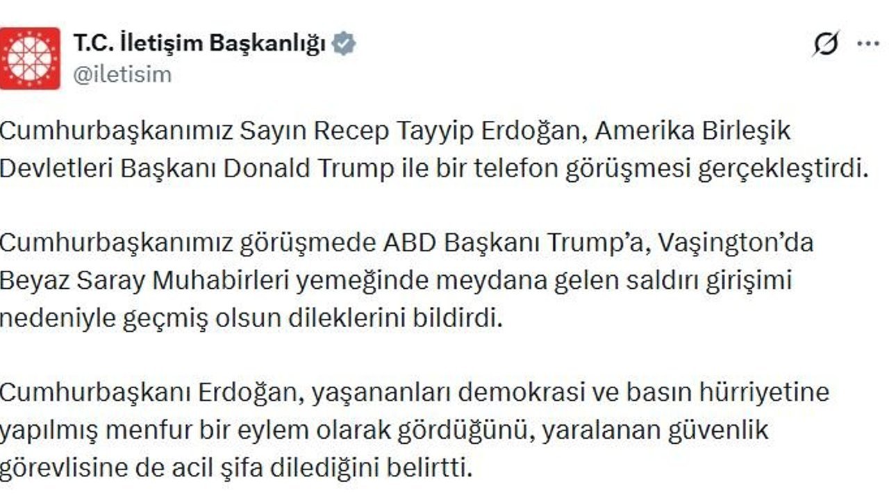 İletişim Başkanlığı'ndan yapılan yazılı açıklamada, 'Cumhurbaşkanımız Sayın Recep Tayyip Erdoğan, Amerika Birleşik Devletleri Başkanı Donald Trump ile bir telefon görüşmesi gerçekleştirdi. Cumhurbaşkanımız görüşmede ABD Başkanı Trump'a, Vaşington'da Beyaz Saray Muhabirleri yemeğinde meydana gelen saldırı girişimi nedeniyle geçmiş olsun dileklerini bildirdi. Cumhurbaşkanı Erdoğan, yaşananları demokrasi ve basın hürriyetine yapılmış menfur bir eylem olarak gördüğünü, yaralanan güvenlik görevlisine de acil şifa dilediğini belirtti' denildi. (DHA)