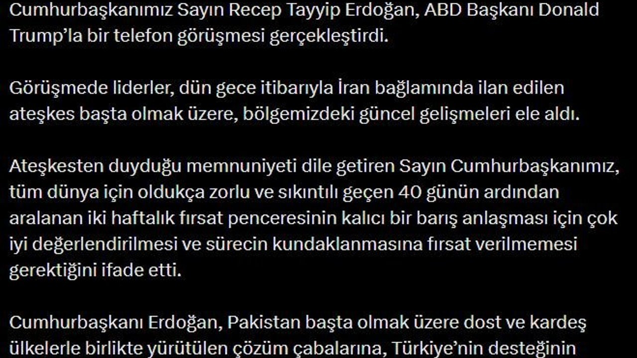 İletişim Başkanlığı'ndan yapılan yazılı açıklamada, 'Cumhurbaşkanımız Sayın Recep Tayyip Erdoğan, ABD Başkanı Donald Trump'la bir telefon görüşmesi gerçekleştirdi. Görüşmede liderler, dün gece itibarıyla İran bağlamında ilan edilen ateşkes başta olmak üzere, bölgemizdeki güncel gelişmeleri ele aldı. Ateşkesten duyduğu memnuniyeti dile getiren Sayın Cumhurbaşkanımız, tüm dünya için oldukça zorlu ve sıkıntılı geçen 40 günün ardından aralanan 2 haftalık fırsat penceresinin kalıcı bir barış anlaşması için çok iyi değerlendirilmesi ve sürecin kundaklanmasına fırsat verilmemesi gerektiğini ifade etti. Cumhurbaşkanı Erdoğan, Pakistan başta olmak üzere dost ve kardeş ülkelerle birlikte yürütülen çözüm çabalarına, Türkiye'nin desteğinin artarak süreceğini vurguladı' ifadelerini kullandı. (DHA)