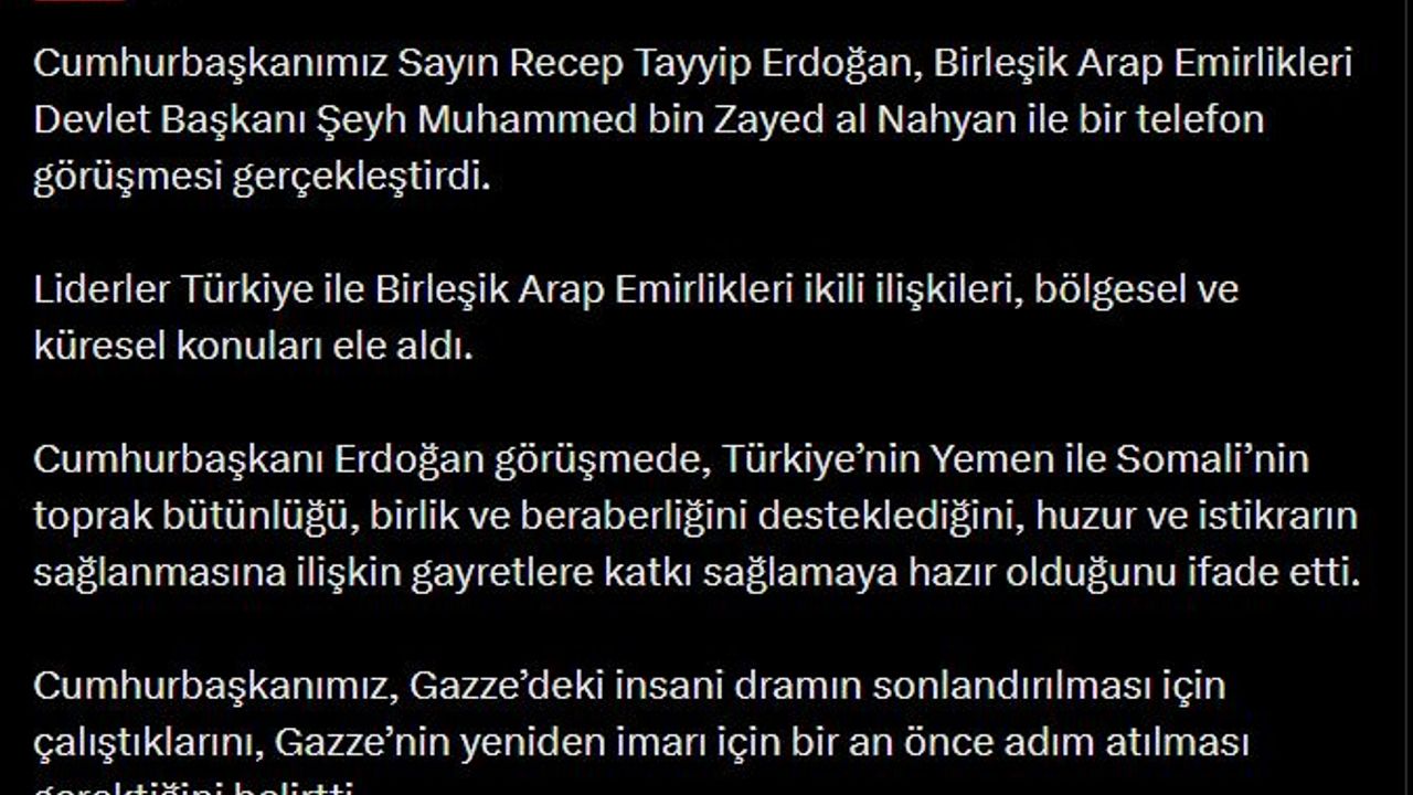 İletişim Başkanlığı'nın sanal medya hesabından yapılan açıklamada, 'Cumhurbaşkanımız Sayın Recep Tayyip Erdoğan, Birleşik Arap Emirlikleri Devlet Başkanı Şeyh Muhammed bin Zayed al Nahyan ile bir telefon görüşmesi gerçekleştirdi. Liderler Türkiye ile Birleşik Arap Emirlikleri ikili ilişkileri, bölgesel ve küresel konuları ele aldı. Cumhurbaşkanı Erdoğan görüşmede, Türkiye'nin Yemen ile Somali'nin toprak bütünlüğü, birlik ve beraberliğini desteklediğini, huzur ve istikrarın sağlanmasına ilişkin gayretlere katkı sağlamaya hazır olduğunu ifade etti. Cumhurbaşkanımız, Gazze'deki insani dramın sonlandırılması için çalıştıklarını, Gazze'nin yeniden imarı için bir an önce adım atılması gerektiğini belirtti' denildi. (DHA)