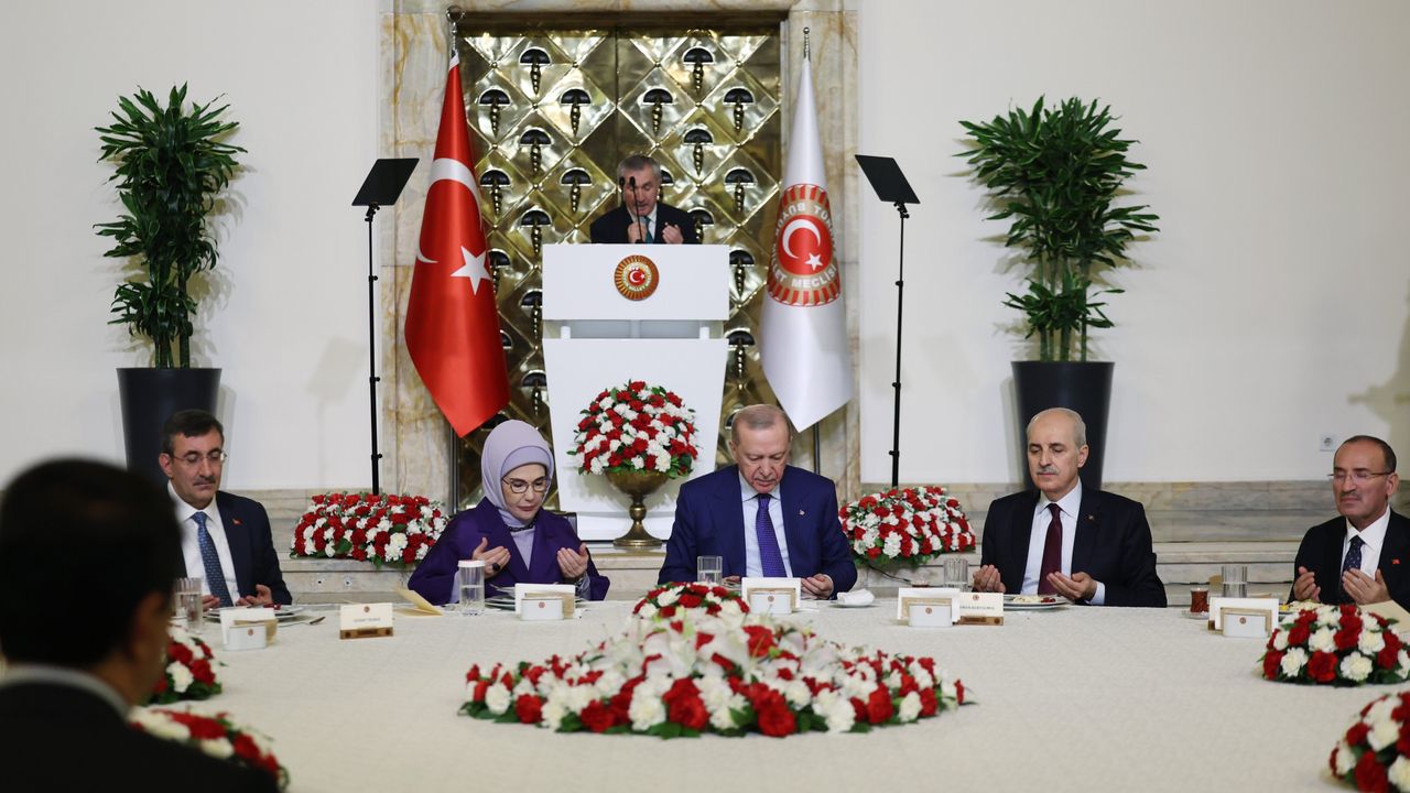 Cumhurbaşkanı Erdoğan, TBMM'de 'Milletvekilleri ile İftar' programına katıldı. Burada konuşan Erdoğan, 'Milli Mücadele'nin en sancılı günlerinde İstiklal Harbimizin Başkomutanı Gazi Mustafa Kemal'in Yüce Meclisimizin kürsüsünden okuduğu, 'Ölmez bu vatan, farz-ı muhal, ölse de hatta, çekmez kürenin sırtı o tabut-u cesimi' mısralarında vücut bulan 'ya istiklal ya ölüm' inancını müstevlilere meydan okuyan yiğitlerin mukaddes davasını bir kez daha kemali hürmetle selamlıyorum. Bu vatan ölmez. Ölmesi farz-ı muhaldır. O farz-ı muhal gerçekleşse de dahi tüm dünya bu ağırlığın altında kalıp çökecektir. Bunun için 'Türkiye Türkiye'den büyüktür' cümlesi sıradan bir söz, hamasi bir söylem asla değildir. Bu ifade Gazi Meclisimizin isminde de zikredildiği gibi kendi varlığının farkında olan bir milletin inancının, iradesinin, aşkının tespit ve tescilidir. Asil ve asıl olan milletin vekilleri olarak bugün o inancı sizler temsil ediyorsunuz. O aşkı sizler temsil ediyorsunuz. O iradeyi sizler temsil ediyorsunuz. Şahsım, ülkem ve milletim adına her birinize ayrı ayrı teşekkür ediyorum' diye konuştu.