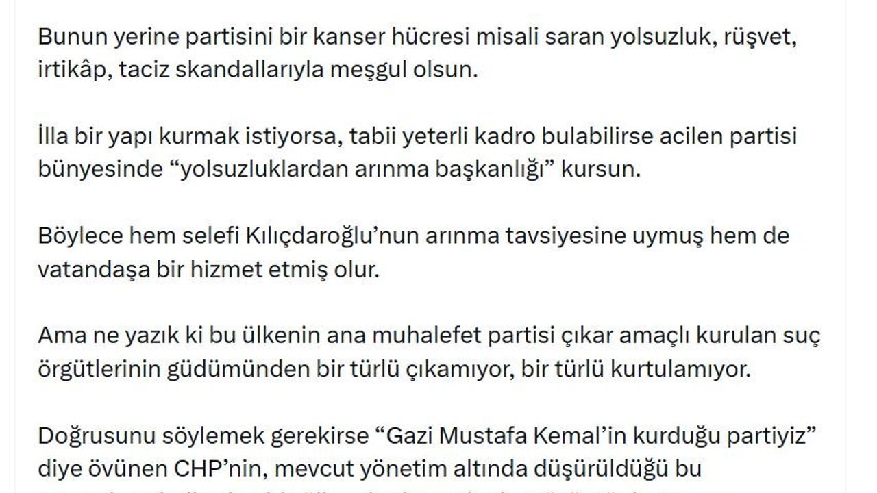 Cumhurbaşkanı Erdoğan, sanal medya hesabından yaptığı açıklamada, 'CHP Genel Başkanı, gerçekten millete ve kadınlara bir faydası dokunsun istiyorsa, bakanlık isimleriyle uğraşmaktan vazgeçsin. Bunun yerine partisini bir kanser hücresi misali saran yolsuzluk, rüşvet, irtikap, taciz skandallarıyla meşgul olsun. İlla bir yapı kurmak istiyorsa, tabii yeterli kadro bulabilirse acilen partisi bünyesinde 'yolsuzluklardan arınma başkanlığı' kursun. Böylece hem selefi Kılıçdaroğlu'nun arınma tavsiyesine uymuş hem de vatandaşa bir hizmet etmiş olur. Ama ne yazık ki bu ülkenin ana muhalefet partisi çıkar amaçlı kurulan suç örgütlerinin güdümünden bir türlü çıkamıyor, bir türlü kurtulamıyor. Doğrusunu söylemek gerekirse 'Gazi Mustafa Kemal'in kurduğu partiyiz' diye övünen CHP'nin mevcut yönetim altında düşürüldüğü bu perperişan hallerden biz ülkemiz siyaseti adına üzüntü duyuyoruz. Türk demokrasisinin inşallah önümüzdeki dönemde hak ettiği olgunlukta, kalitede ve vizyonda bir ana muhalefete kavuşacağına inanıyoruz' ifadelerini kullandı. (DHA)
