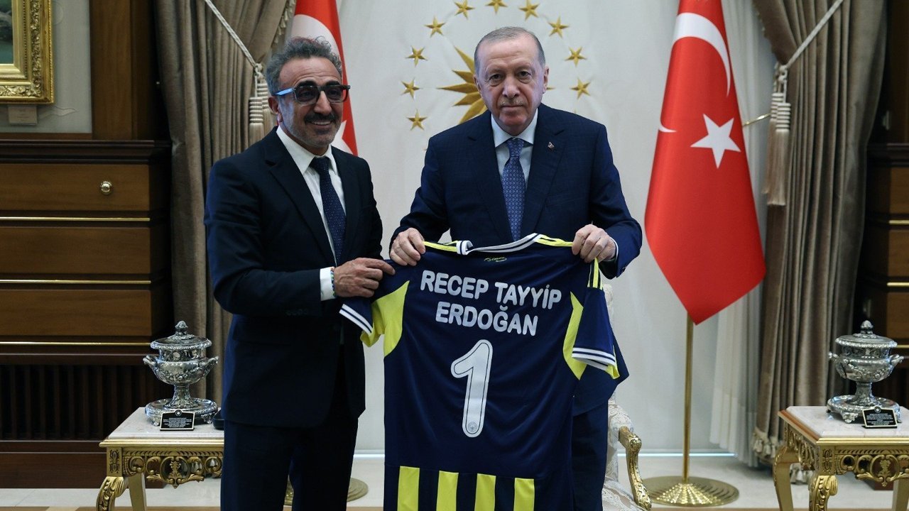 Cumhurbaşkanı Recep Tayyip Erdoğan, Cumhurbaşkanlığı Külliyesi'nde, ABD Ticaret Odası bünyesindeki ABD-Türkiye İş Konseyi Başkanı ve Chobani CEO'su Hamdi Ulukaya'yı kabul etti. Ulukaya, Cumhurbaşkanı Erdoğan'a adının yazılı olduğu Fenerbahçe forması hediye etti. (DHA)