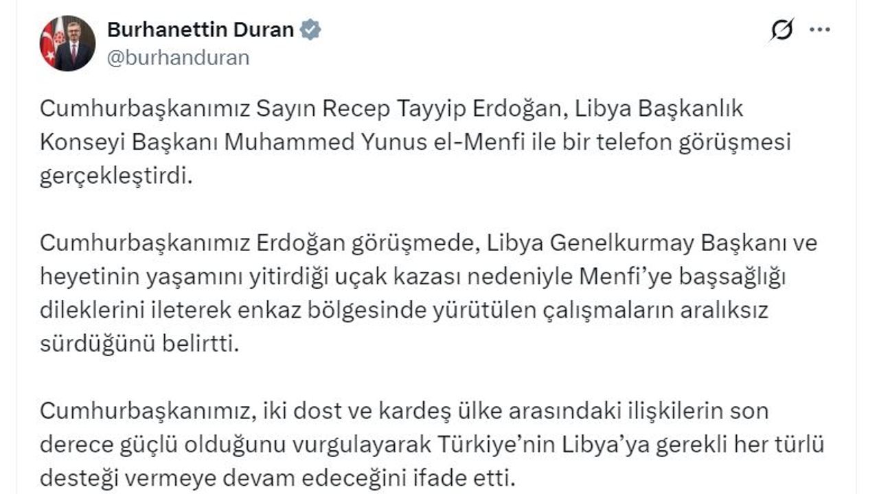 İletişim Başkanı Burhanettin Duran tarafından sosyal medya hesabından yapılan açıklamada, 'Cumhurbaşkanımız Sayın Recep Tayyip Erdoğan, Libya Başkanlık Konseyi Başkanı Muhammed Yunus el-Menfi ile bir telefon görüşmesi gerçekleştirdi. Cumhurbaşkanımız Erdoğan görüşmede, Libya Genelkurmay Başkanı ve heyetinin yaşamını yitirdiği uçak kazası nedeniyle Menfi'ye başsağlığı dileklerini ileterek enkaz bölgesinde yürütülen çalışmaların aralıksız sürdüğünü belirtti. Cumhurbaşkanımız, iki dost ve kardeş ülke arasındaki ilişkilerin son derece güçlü olduğunu vurgulayarak Türkiye'nin Libya'ya gerekli her türlü desteği vermeye devam edeceğini ifade etti' dedi. (DHA)