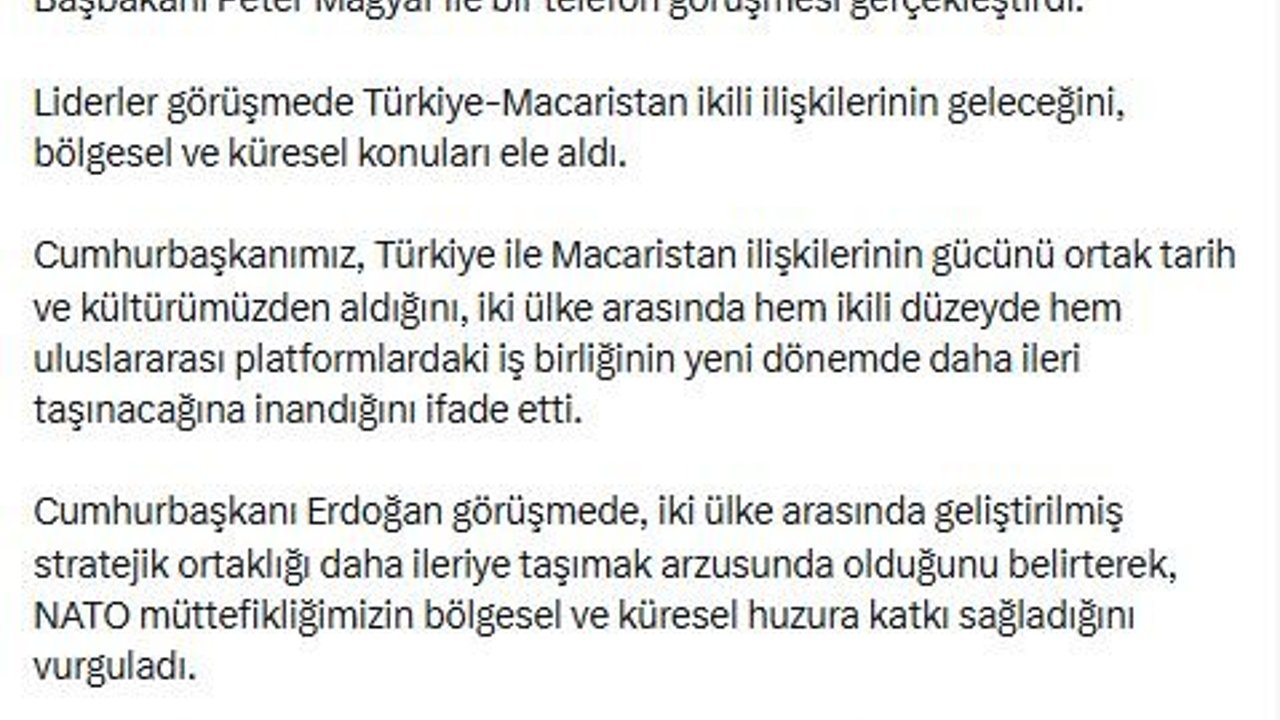 İletişim Başkanlığı'nın sanal medya hesabından yapılan açıklamada, 'Cumhurbaşkanımız Sayın Recep Tayyip Erdoğan, Macaristan Seçilmiş Başbakanı Peter Magyar ile bir telefon görüşmesi gerçekleştirdi. Liderler görüşmede Türkiye-Macaristan ikili ilişkilerinin geleceğini, bölgesel ve küresel konuları ele aldı. Cumhurbaşkanımız, Türkiye ile Macaristan ilişkilerinin gücünü ortak tarih ve kültürümüzden aldığını, iki ülke arasında hem ikili düzeyde hem uluslararası platformlardaki iş birliğinin yeni dönemde daha ileri taşınacağına inandığını ifade etti. Cumhurbaşkanı Erdoğan görüşmede, iki ülke arasında geliştirilmiş stratejik ortaklığı daha ileriye taşımak arzusunda olduğunu belirterek, NATO müttefikliğimizin bölgesel ve küresel huzura katkı sağladığını vurguladı. Cumhurbaşkanımız görüşmede, Seçilmiş Başbakan Magyar'ı seçimlerde elde ettiği başarı nedeniyle tebrik etti' ifadelerine yer verildi. (DHA)