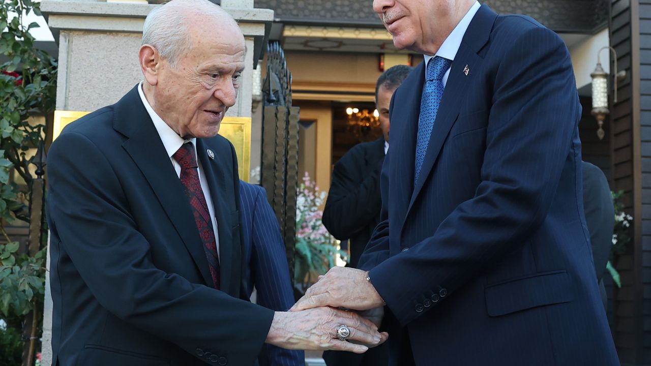 Devlet Bahçeli, görüşme sonrası Cumhurbaşkanı Erdoğan'ı konutun kapısından uğurladı.