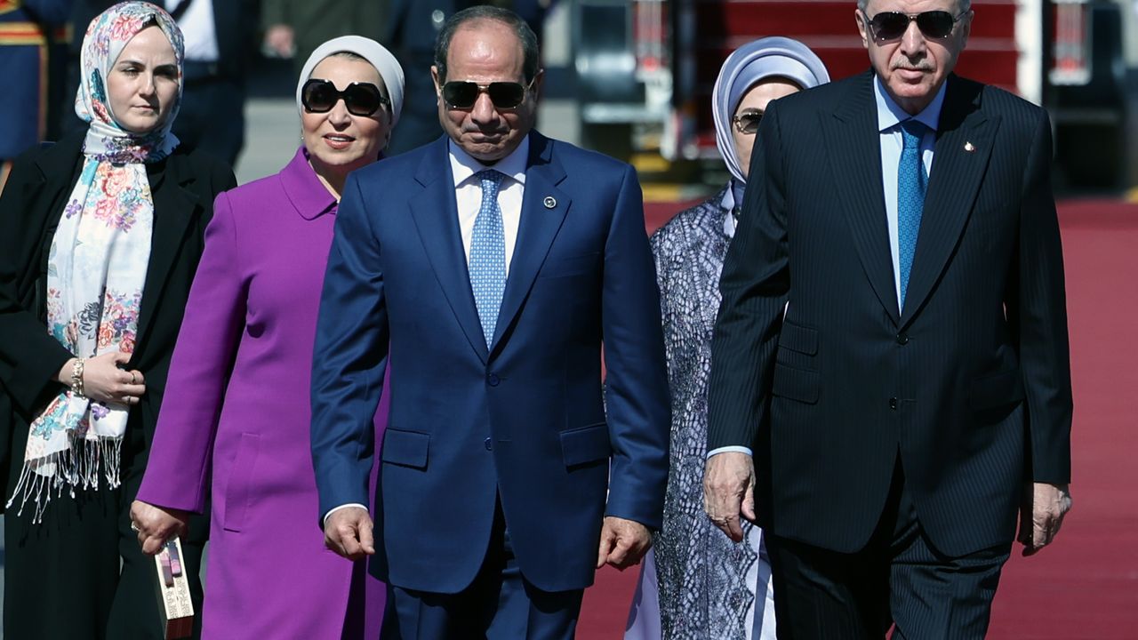 Cumhurbaşkanı Recep Tayyip Erdoğan, Kahire Uluslararası Havalimanı'nda, Mısır Cumhurbaşkanı Abdulfettah es-Sisi ve eşi Entissar Amer ile Türkiye'nin Kahire Büyükelçisi Salih Mutlu Şen tarafından karşılandı.