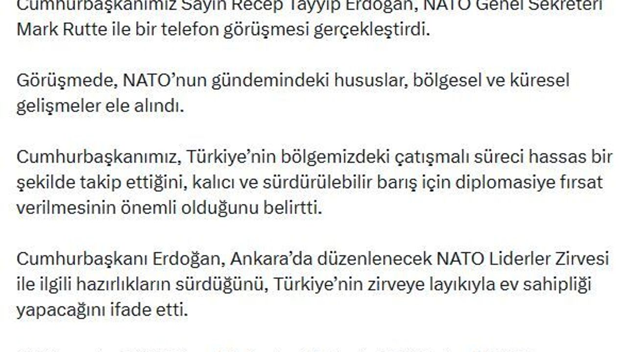 İletişim Başkanlığı'ndan yapılan açıklamada, 'Cumhurbaşkanımız Sayın Recep Tayyip Erdoğan, NATO Genel Sekreteri Mark Rutte ile bir telefon görüşmesi gerçekleştirdi. Görüşmede, NATO'nun gündemindeki hususlar, bölgesel ve küresel gelişmeler ele alındı. Cumhurbaşkanımız, Türkiye'nin bölgemizdeki çatışmalı süreci hassas bir şekilde takip ettiğini, kalıcı ve sürdürülebilir barış için diplomasiye fırsat verilmesinin önemli olduğunu belirtti. Cumhurbaşkanı Erdoğan, Ankara'da düzenlenecek NATO Liderler Zirvesi ile ilgili hazırlıkların sürdüğünü, Türkiye'nin zirveye layıkıyla ev sahipliği yapacağını ifade etti. Görüşmede, NATO Genel Sekreteri Rutte de NATO olarak 360 derece bakış açısıyla müttefiklerin güvenliğinin teminine katkı sunmaya devam edeceklerini belirtti' denildi. (DHA)