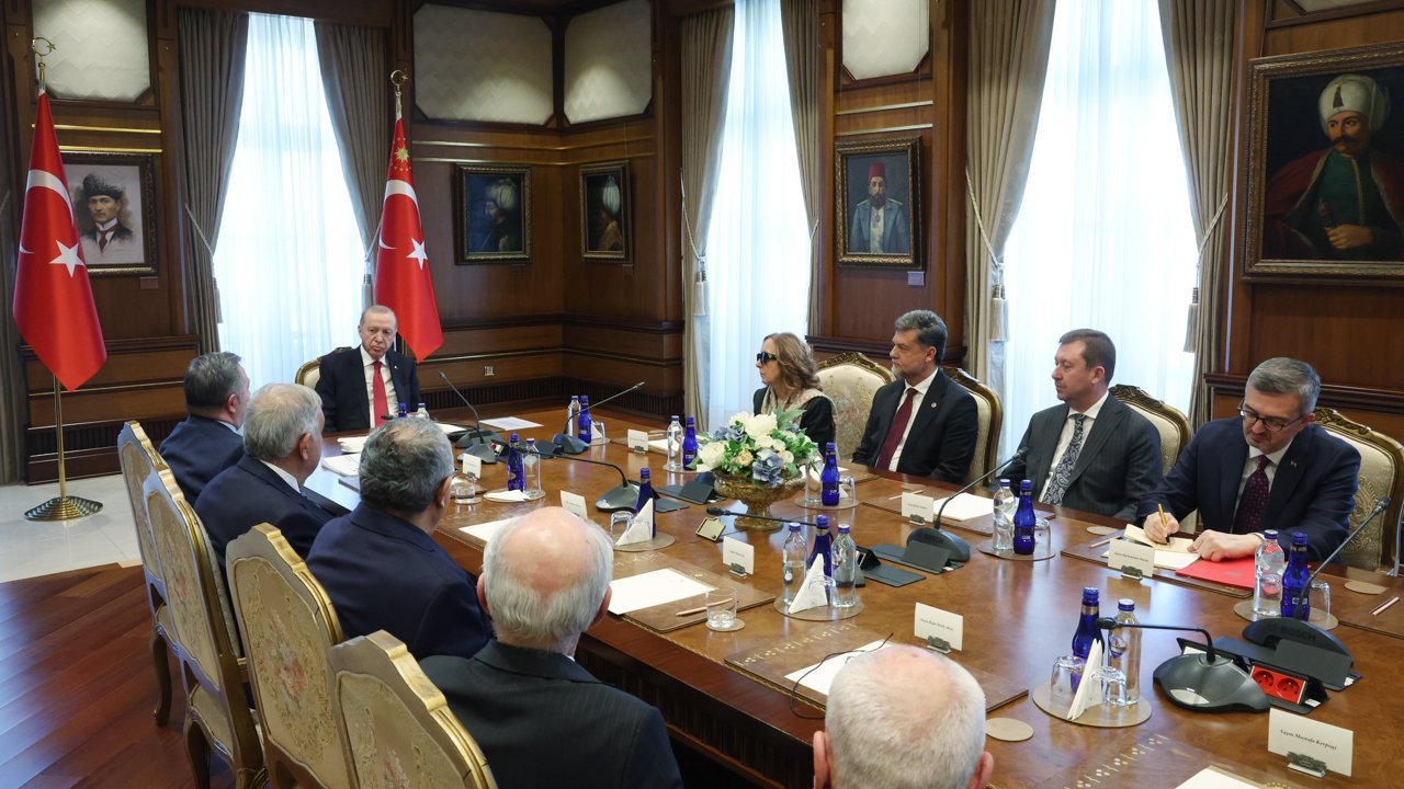 Cumhurbaşkanı Erdoğan, Türk Demokrasi Vakfı heyetini Cumhurbaşkanlığı Külliyesi'nde kabul etti. Basına kapalı gerçekleşen kabulden fotoğraf paylaşıldı. (DHA)