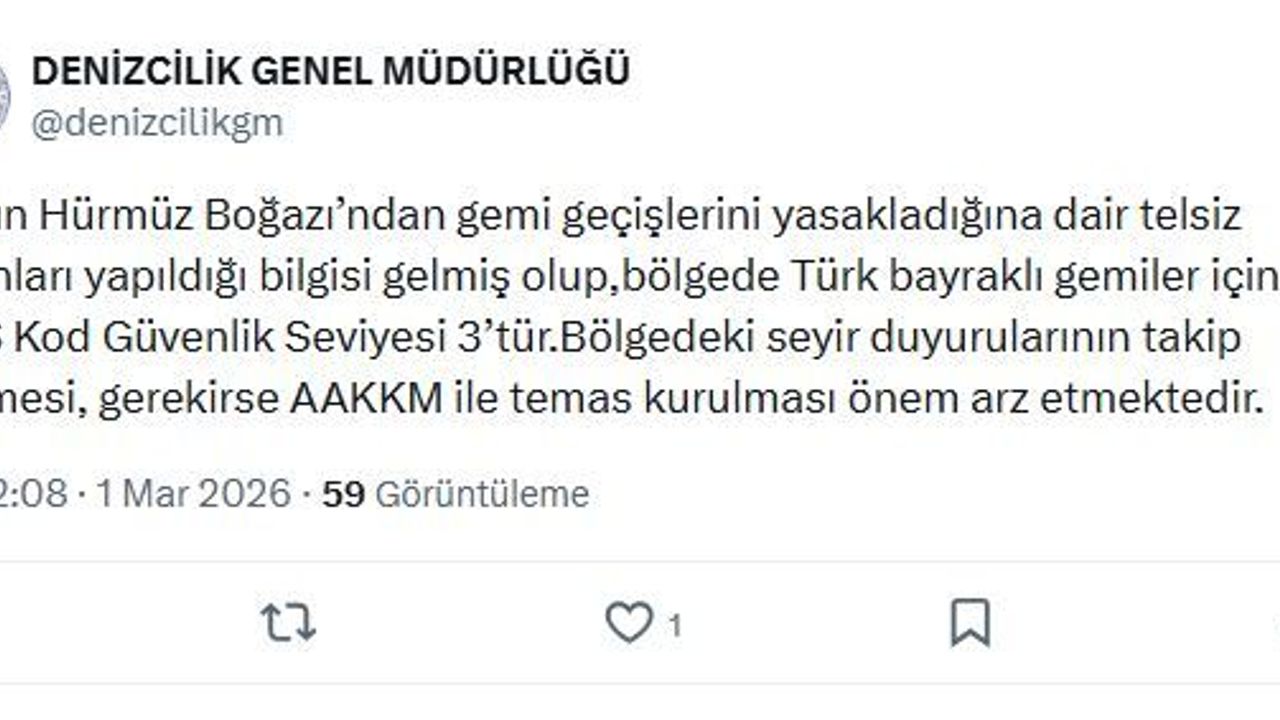 Denizcilik Genel Müdürlüğü'nün sanal medya hesabından yapılan açıklamada, 'İran'ın Hürmüz Boğazı'ndan gemi geçişlerini yasakladığına dair telsiz yayınları yapıldığı bilgisi gelmiş olup, bölgede Türk bayraklı gemiler için ISPS Kod Güvenlik Seviyesi 3'tür. Bölgedeki seyir duyurularının takip edilmesi, gerekirse Araman Kurtarma Koordinsayon Merkezi (AAKKM) ile temas kurulması önem arz etmektedir' denildi. (DHA)