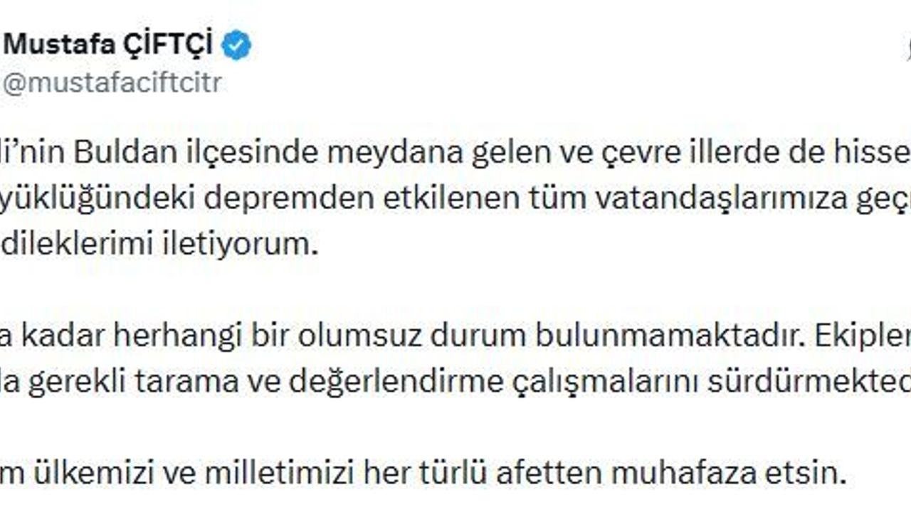 İçişleri Bakanı Mustafa Çiftçi de sanal medya hesabından yaptığı açıklamada, 'Denizli'nin Buldan ilçesinde meydana gelen ve çevre illerde de hissedilen 5.1 büyüklüğündeki depremden etkilenen tüm vatandaşlarımıza geçmiş olsun dileklerimi iletiyorum. Şu ana kadar herhangi bir olumsuz durum bulunmamaktadır. Ekiplerimiz sahada gerekli tarama ve değerlendirme çalışmalarını sürdürmektedir. Rabb'im ülkemizi ve milletimizi her türlü afetten muhafaza etsin' ifadelerine yer verdi. (DHA)