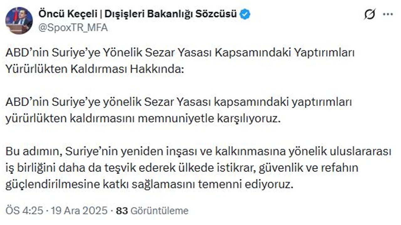 Dışişleri Bakanlığı Sözcüsü Keçeli, sosyal medya hesabından yaptığı açıklamada, 'ABD'nin Suriye'ye yönelik Sezar Yasası kapsamındaki yaptırımları yürürlükten kaldırmasını memnuniyetle karşılıyoruz. Bu adımın, Suriye'nin yeniden inşası ve kalkınmasına yönelik uluslararası iş birliğini daha da teşvik ederek ülkede istikrar, güvenlik ve refahın güçlendirilmesine katkı sağlamasını temenni ediyoruz' ifadelerini kullandı. (DHA)