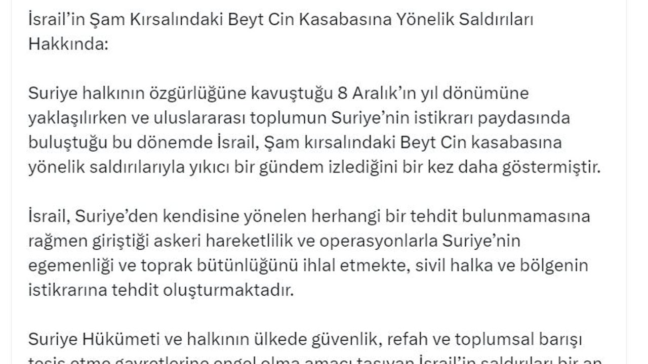 Dışişleri Sözcüsü Keçeli, sosyal medya hesabından yaptığı açıklamada, 'Suriye halkının özgürlüğüne kavuştuğu 8 Aralık'ın yıl dönümüne yaklaşılırken ve uluslararası toplumun Suriye'nin istikrarı paydasında buluştuğu bu dönemde İsrail, Şam kırsalındaki Beyt Cin kasabasına yönelik saldırılarıyla yıkıcı bir gündem izlediğini bir kez daha göstermiştir. İsrail, Suriye'den kendisine yönelen herhangi bir tehdit bulunmamasına rağmen giriştiği askeri hareketlilik ve operasyonlarla Suriye'nin egemenliği ve toprak bütünlüğünü ihlal etmekte, sivil halka ve bölgenin istikrarına tehdit oluşturmaktadır. Suriye hükümeti ve halkının ülkede güvenlik, refah ve toplumsal barışı tesis etme gayretlerine engel olma amacı taşıyan İsrail'in saldırıları bir an evvel sona erdirilmelidir. Bu hususta uluslararası toplumun sorumluluk sahibi tüm üyelerine vazife düşmektedir' dedi. (DHA)