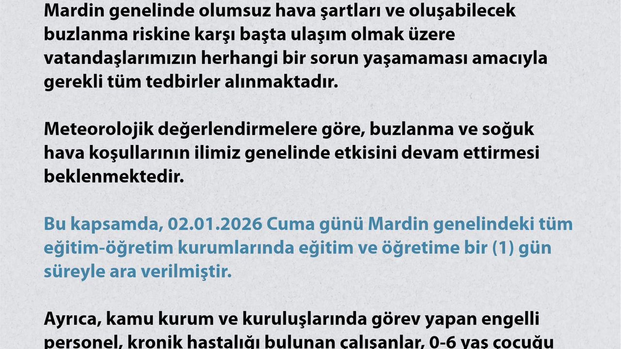 Mardin Valiliği'nden yapılan açıklamada ise 'Mardin genelinde olumsuz hava şartları ve oluşabilecek buzlanma riskine karşı başta ulaşım olmak üzere vatandaşlarımızın herhangi bir sorun yaşamaması amacıyla gerekli tüm tedbirler alınmaktadır. Meteorolojik değerlendirmelere göre, buzlanma ve soğuk hava koşullarının ilimiz genelinde etkisini devam ettirmesi beklenmektedir. Bu kapsamda, 02.01.2026 Cuma günü Mardin genelindeki tüm eğitim-öğretim kurumlarında eğitim ve öğretime bir (1) gün süreyle ara verilmiştir. Ayrıca, kamu kurum ve kuruluşlarında görev yapan engelli personel, kronik hastalığı bulunan çalışanlar, 0-6 yaş çocuğu olan anneler ile hamile personel aynı gün idari izinli sayılacaktır' denildi. (DHA)