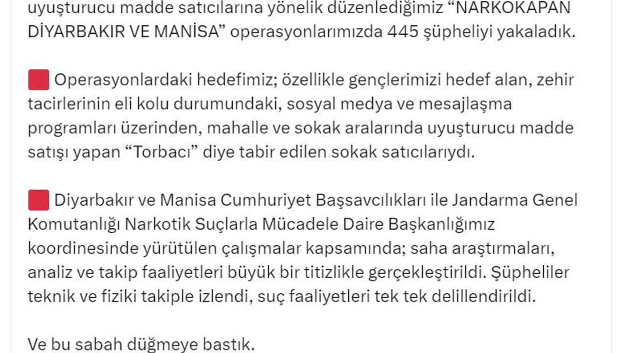 ANKARA, (DHA)- İÇİŞLERİ Bakanı Ali Yerlikaya, Diyarbakır ve Manisa'da uyuşturucu madde satıcılarına yönelik düzenlenen operasyonlarda 445 şüphelinin yakalandığını duyurdu.