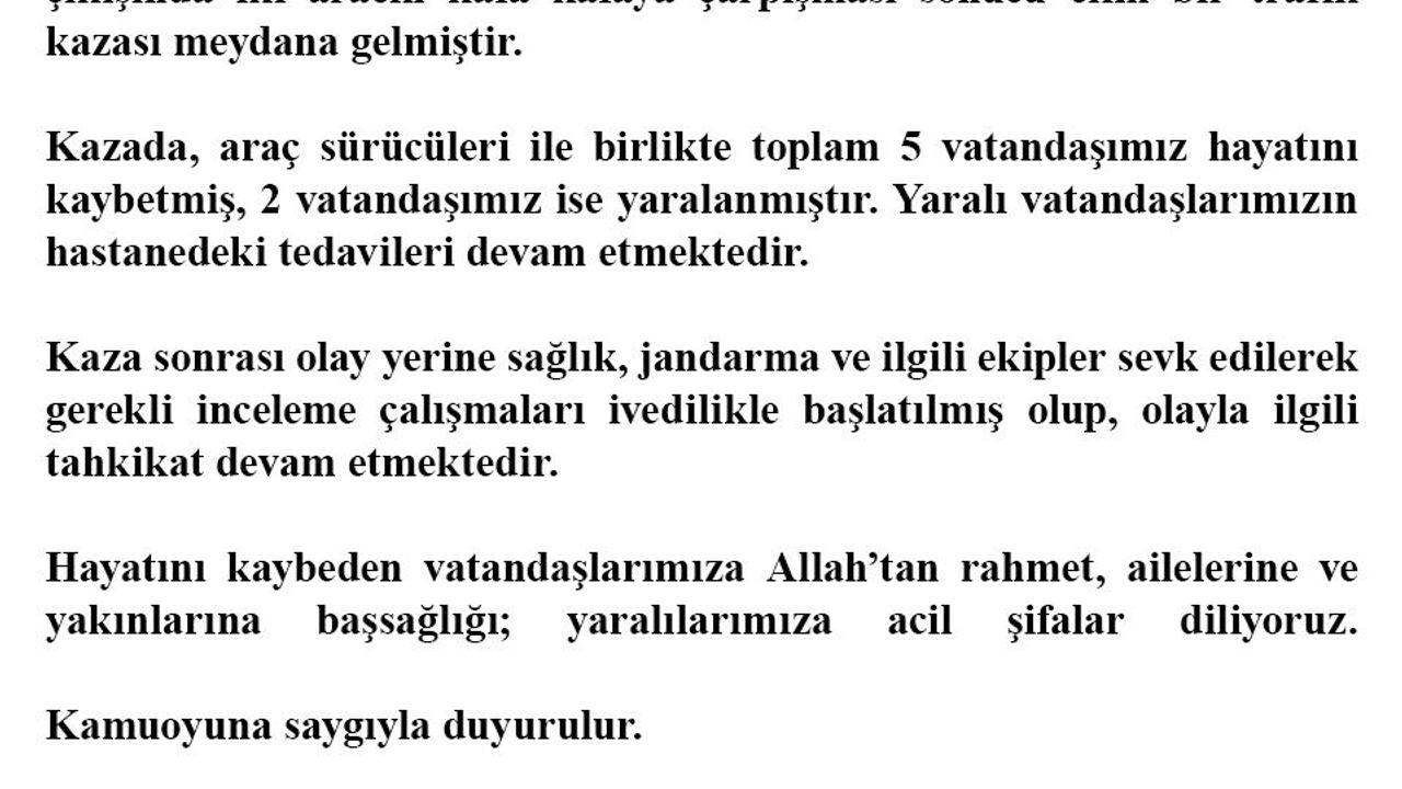 '24 Şubat 2026 tarihinde, Diyarbakır ili Çınar ilçesi Çınarköy Mahallesi çıkışında iki aracın kafa kafaya çarpışması sonucu elim bir trafik kazası meydana gelmiştir. Kazada, araç sürücüleri ile birlikte toplam 5 vatandaşımız hayatını kaybetmiş, 2 vatandaşımız ise yaralanmıştır. Yaralı vatandaşlarımızın hastanedeki tedavileri devam etmektedir. Kaza sonrası olay yerine sağlık, jandarma ve ilgili ekipler sevk edilerek gerekli inceleme çalışmaları ivedilikle başlatılmış olup, olayla ilgili tahkikat devam etmektedir. Hayatını kaybeden vatandaşlarımıza Allah'tan rahmet, ailelerine ve yakınlarına başsağlığı; yaralılarımıza acil şifalar diliyoruz.' (DHA)
