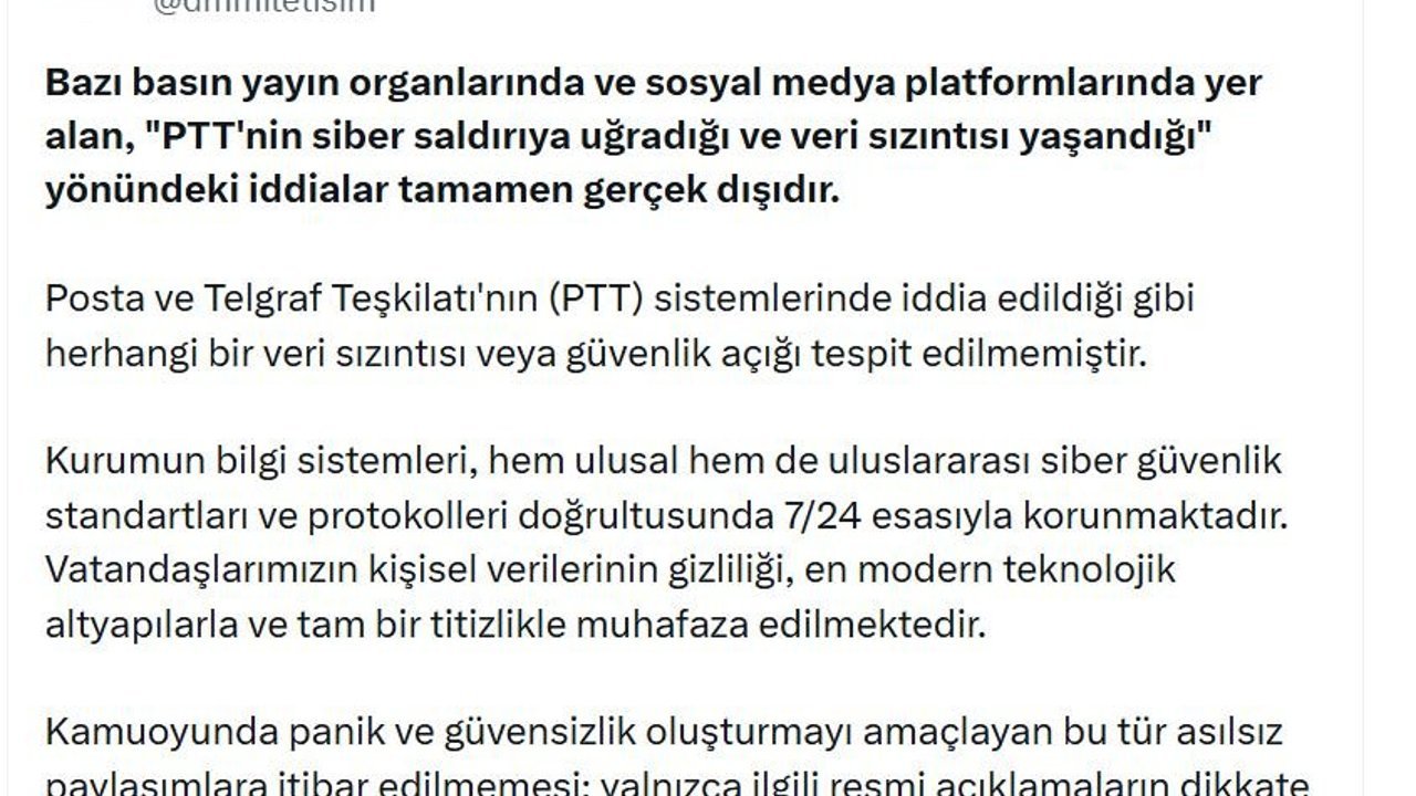 DMM'nin sanal medya hesabından yapılan açıklamada, 'Bazı basın yayın organlarında ve sosyal medya platformlarında yer alan, 'PTT'nin siber saldırıya uğradığı ve veri sızıntısı yaşandığı' yönündeki iddialar tamamen gerçek dışıdır. Posta ve Telgraf Teşkilatı'nın (PTT) sistemlerinde iddia edildiği gibi herhangi bir veri sızıntısı veya güvenlik açığı tespit edilmemiştir. Kurumun bilgi sistemleri, hem ulusal hem de uluslararası siber güvenlik standartları ve protokolleri doğrultusunda 7/24 esasıyla korunmaktadır. Vatandaşlarımızın kişisel verilerinin gizliliği, en modern teknolojik altyapılarla ve tam bir titizlikle muhafaza edilmektedir. Kamuoyunda panik ve güvensizlik oluşturmayı amaçlayan bu tür asılsız paylaşımlara itibar edilmemesi; yalnızca ilgili resmi açıklamaların dikkate alınması önemle rica olunur' denildi. (DHA)